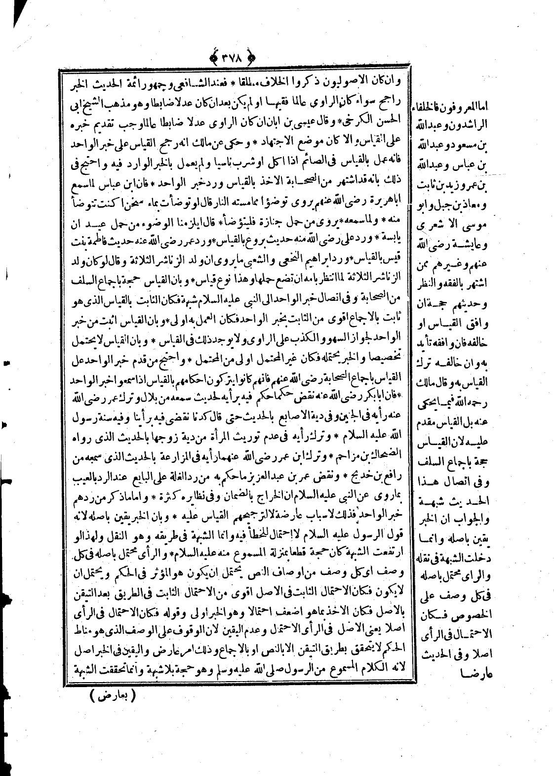 أَمَّا الْمَعْرُوفُونَ فَالْخُلَفَاءُ الرَّاشِدُونَ وَعَبْدُ اللَّهِ بْنُ مَسْعُودٍ وَعَبْدُ اللَّهِ بْنُ عَبَّاسٍ وَعَبْدُ اللَّهُ بْنُ عَمْرٍو وَزَيْدُ بْنُ ثَابِتٍ وَمُعَاذُ بْنُ جَبْلٍ وَأَبُو مُوسَى الْأَشْعَرِيُّ وَعَائِشَةُ - رَضِيَ اللَّهُ عَنْهُمْ - وَغَيْرُهُمْ مِمَّنْ اُشْتُهِرَ بِالْفِقْهِ وَالنَّظَرِ وَحَدِيثُهُمْ حُجَّةٌ إنْ وَافَقَ الْقِيَاسَ أَوْ خَالَفَهُ فَإِنْ وَافَقَهُ تَأَيَّدَ بِهِ، وَإِنْ خَالَفَهُ تُرِكَ الْقِيَاسُ بِهِ، وَقَالَ مَالِكٌ - رَحِمَهُ اللَّهُ - فِيمَا يُحْكَى عَنْهُ بَلْ الْقِيَاسُ مُقَدَّمٌ عَلَيْهِ؛ لِأَنَّ الْقِيَاسَ حُجَّةٌ بِإِجْمَاعِ السَّلَفِ وَفِي اتِّصَالِ هَذَا الْحَدِيثِ شُبْهَةٌ وَالْجَوَابُ أَنَّ الْخَبَرَ يَقِينٌ بِأَصْلِهِ؛ وَإِنَّمَا دَخَلَتْ الشُّبْهَةُ فِي نَقْلِهِ وَالرَّأْيُ مُحْتَمَلٌ بِأَصْلِهِ فِي كُلِّ وَصْفٍ عَلَى الْخُصُوصِ فَكَانَ الِاحْتِمَالُ فِي الرَّأْيِ أَصْلًا وَفِي الْحَدِيثِ عَارِضًا