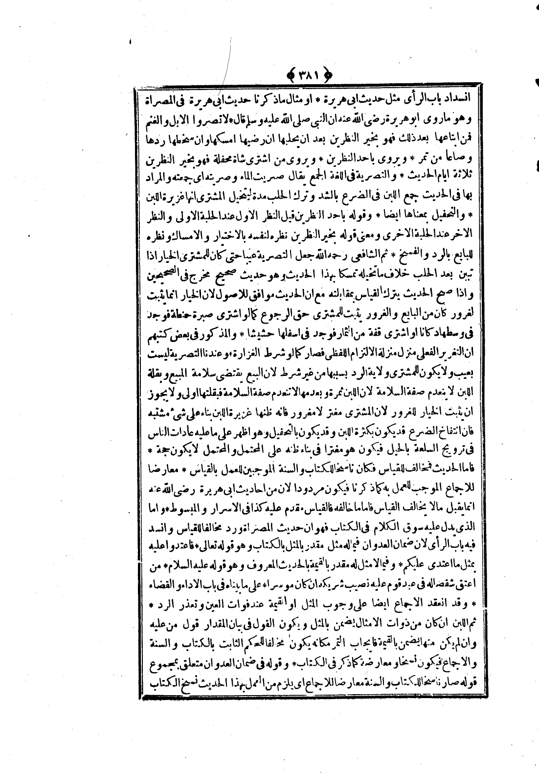 ـــــــــــــــــــــــــــــQانْسِدَادِ بَابِ الرَّأْيِ، مِثْلُ حَدِيثِ أَبِي هُرَيْرَةَ أَوْ مِثَالُ مَا ذَكَرْنَا حَدِيثُ أَبِي هُرَيْرَةَ فِي الْمُصَرَّاةِ وَهُوَ مَا رَوَى أَبُو هُرَيْرَة - رَضِيَ اللَّهُ عَنْهُ - أَنَّ النَّبِيَّ - صَلَّى اللَّهُ عَلَيْهِ وَسَلَّمَ - قَالَ «لَا تُصَرُّوا الْإِبِلَ وَالْغَنَمَ فَمَنْ ابْتَاعَهَا بَعْدَ ذَلِكَ فَهُوَ بِخَيْرِ النَّظَرَيْنِ بَعْدَ أَنْ يَحْلُبَهَا إنْ رَضِيَهَا أَمْسَكَهَا، وَإِنْ سَخِطَهَا رَدَّهَا وَصَاعًا مِنْ تَمْرٍ» وَيُرْوَى بِأَحَدِ النَّظَرَيْنِ وَيُرْوَى «مَنْ اشْتَرَى شَاةً مُحَفَّلَةً فَهُوَ بِخَيْرِ النَّظَرَيْنِ ثَلَاثَةَ أَيَّامٍ» الْحَدِيثَ وَالتَّصْرِيَةُ فِي اللُّغَةِ الْجَمْعُ يُقَالُ صَرَيْت الْمَاءَ وَصَرَّيْتُهُ أَيْ جَمَعْتُهُ وَالْمُرَادُ بِهَا فِي الْحَدِيثِ جَمْعُ اللَّبَنِ فِي الضَّرْعِ بِالشَّدِّ وَتَرْكُ الْحَلْبِ مُدَّةً لِيَتَخَيَّلَ الْمُشْتَرِي أَنَّهَا غَزِيرَةُ اللَّبَنِ وَالتَّحْفِيلُ بِمَعْنَاهَا أَيْضًا وَقَوْلُهُ بِأَحَدِ النَّظَرَيْنِ قِيلَ النَّظَرُ الْأَوَّلُ عِنْدَ الْحَلْبَةِ الْأُولَى وَالنَّظَرُ الْآخَرُ عِنْدَ الْحَلْبَةِ الْأُخْرَى، وَمَعْنَى قَوْلِهِ بِخَيْرِ النَّظَرَيْنِ نَظَرُهُ لِنَفْسِهِ بِالِاخْتِيَارِ وَالْإِمْسَاكِ، وَنَظَرُهُ لِلْبَائِعِ بِالرَّدِّ وَالْفَسْخِ ثُمَّ الشَّافِعِيُّ - رَحِمَهُ اللَّهُ - جَعَلَ التَّصْرِيَةَ عَيْبًا حَتَّى كَانَ لِلْمُشْتَرِي الْخِيَارُ إذَا تَبَيَّنَ بَعْدَ الْحَلْبِ خِلَافَ مَا تَخَيَّلَهُ تَمَسُّكًا بِهَذَا الْحَدِيثِ وَهُوَ حَدِيثٌ صَحِيحٌ مُخَرَّجٌ فِي الصَّحِيحَيْنِ وَإِذَا صَحَّ الْحَدِيثُ يُتْرَكُ الْقِيَاسُ بِمُقَابَلَتِهِ مَعَ أَنَّ الْحَدِيثَ مُوَافِقٌ لِلْأُصُولِ؛ لِأَنَّ الْخِيَارَ إنَّمَا يَثْبُتُ لِغُرُورٍ كَانَ مِنْ الْبَائِعِ، وَالْغُرُورُ يُثْبِتُ لِلْمُشْتَرِي حَقَّ الرُّجُوعِ كَمَا لَوْ اشْتَرَى صُبْرَةَ حِنْطَةٍ فَوَجَدَ فِي وَسَطِهَا دُكَّانًا أَوْ اشْتَرَى قُفَّةً مِنْ الثِّمَارِ فَوَجَدَ فِي أَسْفَلِهَا حَشِيشًا.