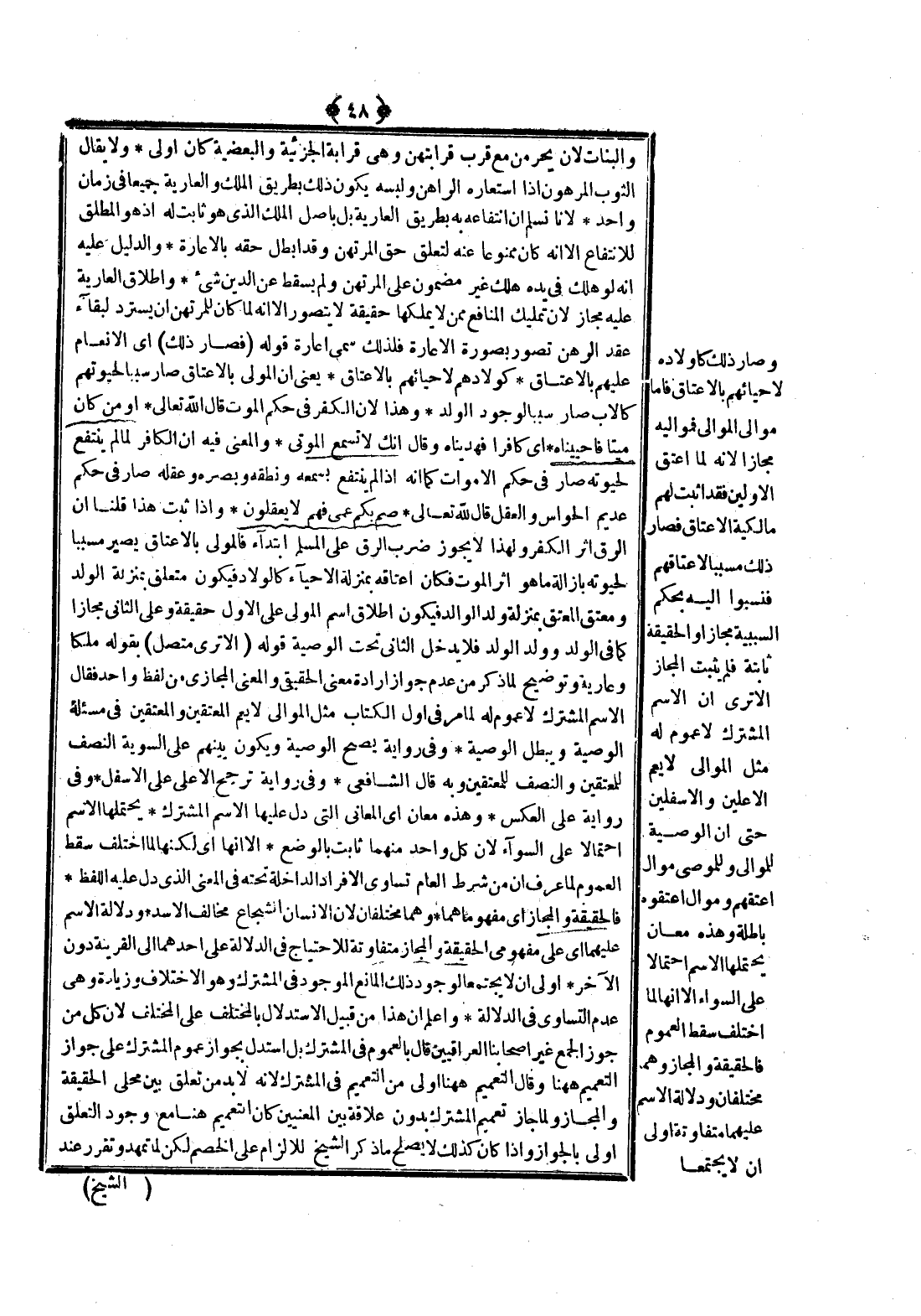قَوْلُهُ (أَلَا تَرَى مُتَّصِلٌ) بِقَوْلِهِ مِلْكًا وَعَارِيَّةً وَتَوْضِيحٌ لِمَا ذَكَرَ مِنْ عَدَمِ جَوَازِ إرَادَةِ مَعْنَى الْحَقِيقِيِّ وَالْمَعْنَى الْمَجَازِيِّ مِنْ لَفْظٍ وَاحِدٍ فَقَالَ الِاسْمُ الْمُشْتَرَكُ لَا عُمُومَ لَهُ لِمَا مَرَّ فِي أَوَّلِ الْكِتَابِ مِثْلُ الْمَوَالِي لَا يَعُمُّ الْمُعْتَقِينَ وَالْمُعْتِقِينَ فِي مَسْأَلَةِ الْوَصِيَّةِ وَيُبْطِلُ الْوَصِيَّةَ. وَفِي رِوَايَةٍ يَصِحُّ الْوَصِيَّةُ وَيَكُونُ بَيْنَهُمْ عَلَى السَّوِيَّةِ النِّصْفُ لِلْمُعْتَقِينَ وَالنِّصْفُ لِلْمُعْتِقِينَ وَبِهِ قَالَ الشَّافِعِيُّ. وَفِي رِوَايَةٍ تُرَجِّحُ الْأَعْلَى عَلَى الْأَسْفَلِ. وَفِي رِوَايَةٍ عَلَى الْعَكْسِ. وَهَذِهِ مَعَانٍ أَيْ الْمَعَانِي الَّتِي دَلَّ عَلَيْهَا الِاسْمُ الْمُشْتَرَكُ. يَحْتَمِلُهَا الِاسْمُ احْتِمَالًا عَلَى السَّوَاءِ؛ لِأَنَّ كُلَّ وَاحِدٍ مِنْهُمَا ثَابِتٌ بِالْوَضْعِ. إلَّا أَنَّهَا أَيْ لَكِنَّهَا لَمَّا اخْتَلَفَ سَقَطَ الْعُمُومُ لِمَا عُرِفَ أَنَّ مِنْ شَرْطِ الْعَامِّ تَسَاوِي الْأَفْرَادِ الدَّاخِلَةِ تَحْتَهُ فِي الْمَعْنَى الَّذِي دَلَّ عَلَيْهِ اللَّفْظُ. فَالْحَقِيقَةُ وَالْمَجَازُ أَيْ مَفْهُومَاهُمَا. وَهُمَا مُخْتَلِفَانِ؛ لِأَنَّ الْإِنْسَانَ الشُّجَاعَ مُخَالِفُ الْأَسَدِ.