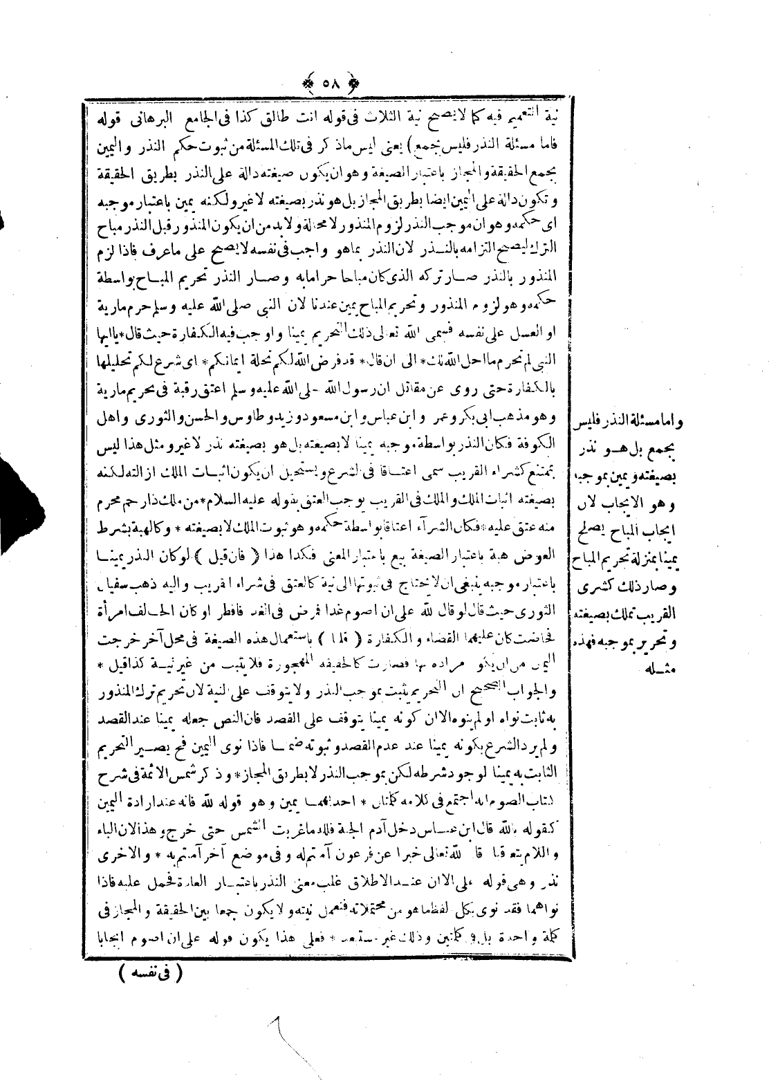 ـــــــــــــــــــــــــــــQنِيَّةُ التَّعْمِيمِ فِيهِ كَمَا لَا يَصِحُّ نِيَّةُ الثَّلَاثِ فِي قَوْلِهِ أَنْتِ طَالِقٌ كَذَا فِي الْجَامِعِ الْبُرْهَانِيِّ. قَوْلُهُ (فَأَمَّا مَسْأَلَةُ النَّذْرِ فَلَيْسَ بِجَمْعٍ) يَعْنِي لَيْسَ مَا ذُكِرَ فِي تِلْكَ الْمَسْأَلَةِ مِنْ ثُبُوتِ حُكْمِ النَّذْرِ وَالْيَمِينِ بِجَمْعِ الْحَقِيقَةِ وَالْمَجَازِ بِاعْتِبَارِ الصِّيغَةِ وَهُوَ أَنْ يَكُونَ صِيغَتُهُ دَالَّةً عَلَى النَّذْرِ بِطَرِيقِ الْحَقِيقَةِ وَتَكُونَ دَالَّةً عَلَى الْيَمِينِ أَيْضًا بِطَرِيقِ الْمَجَازِ بَلْ هُوَ نَذْرٌ بِصِيغَتِهِ لَا غَيْرُ وَلَكِنَّهُ يَمِينٌ بِاعْتِبَارِ مُوجِبِهِ أَيْ حُكْمِهِ وَهُوَ أَنَّ مُوجِبَ النَّذْرِ لُزُومُ الْمَنْذُورِ لَا مَحَالَةَ، وَلَا بُدَّ مِنْ أَنْ يَكُونَ الْمَنْذُورُ قَبْلَ النَّذْرِ مُبَاحَ التَّرْكِ لِيَصِحَّ الْتِزَامُهُ بِالنَّذْرِ؛ لِأَنَّ النَّذْرَ بِمَا هُوَ وَاجِبٌ فِي نَفْسِهِ لَا يَصِحُّ عَلَى مَا عُرِفَ فَإِذَا لَزِمَ الْمَنْذُورُ بِالنَّذْرِ صَارَ تَرْكُهُ الَّذِي كَانَ مُبَاحًا حَرَامًا بِهِ وَصَارَ النَّذْرُ تَحْرِيمَ الْمُبَاحِ بِوَاسِطَةِ حُكْمِهِ وَهُوَ لُزُومُ الْمَنْذُورِ، وَتَحْرِيمُ الْمُبَاحِ يَمِينٌ عِنْدَنَا؛ لِأَنَّ
