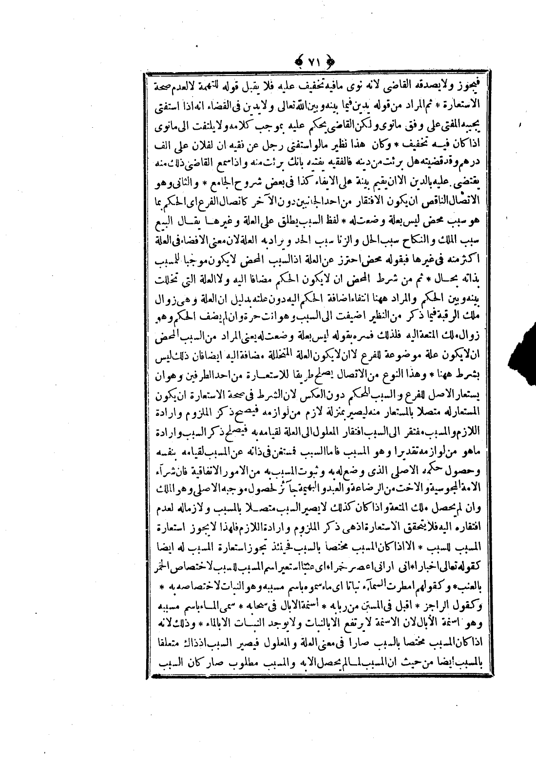 وَهَذَا النَّوْعُ مِنْ الِاتِّصَالِ يَصْلُحُ طَرِيقًا لِلِاسْتِعَارَةِ مِنْ أَحَدِ الطَّرَفَيْنِ وَهُوَ أَنْ يُسْتَعَارَ الْأَصْلُ لِلْفَرْعِ وَالسَّبَبُ لِلْحُكْمِ دُونَ الْعَكْسِ؛ لِأَنَّ الشَّرْطَ فِي صِحَّةِ الِاسْتِعَارَةِ أَنْ يَكُونَ الْمُسْتَعَارُ لَهُ مُتَّصِلًا بِالْمُسْتَعَارِ مِنْهُ لِيَصِيرَ بِمَنْزِلَةِ لَازِمٍ مِنْ لَوَازِمِهِ فَيَصِحَّ ذِكْرُ الْمَلْزُومِ وَإِرَادَةُ اللَّازِمِ وَالْمُسَبَّبُ مُفْتَقِرٌ إلَى السَّبَبِ افْتِقَارَ الْمَعْلُولِ إلَى الْعِلَّةِ لِقِيَامِهِ بِهِ فَيَصْلُحُ ذِكْرُ السَّبَبِ وَإِرَادَةُ مَا هُوَ مِنْ لَوَازِمِهِ تَقْدِيرًا وَهُوَ الْمُسَبَّبُ فَأَمَّا السَّبَبُ فَمُسْتَغْنٍ فِي ذَاتِهِ عَنْ الْمُسَبَّبِ لِقِيَامِهِ بِنَفْسِهِ وَحُصُولِ حُكْمِهِ الْأَصْلِيِّ الَّذِي وُضِعَ لَهُ بِهِ وَثُبُوتُ الْمُسَبَّبِ بِهِ مِنْ الْأُمُورِ الِاتِّفَاقِيَّةِ فَإِنَّ شِرَاءَ الْأَمَةِ الْمَجُوسِيَّةِ وَالْأُخْتِ مِنْ الرَّضَاعَةِ وَالْعَبْدِ وَالْبَهِيمَةِ جَائِزٌ لِحُصُولِ مُوجِبِهِ الْأَصْلِيِّ وَهُوَ الْمِلْكُ وَإِنْ لَمْ يَحْصُلْ مِلْكُ الْمُتْعَةِ وَإِذَا كَانَ كَذَلِكَ لَا يَصِيرُ السَّبَبُ مُتَّصِلًا بِالْمُسَبِّبِ وَلَازِمًا لَهُ لِعَدَمِ افْتِقَارِهِ إلَيْهِ فَلَا يَتَحَقَّقُ الِاسْتِعَارَةُ إذْ هِيَ ذِكْرُ الْمَلْزُومِ وَإِرَادَةُ اللَّازِمِ فَلِهَذَا لَا يَجُوزُ اسْتِعَارَةُ الْمُسَبَّبِ لِلسَّبَبِ. إلَّا إذَا كَانَ الْمُسَبَّبُ مُخْتَصًّا بِالسَّبَبِ فَحِينَئِذٍ تَجُوزُ اسْتِعَارَةُ الْمُسَبَّبِ لَهُ أَيْضًا كَقَوْلِهِ تَعَالَى إخْبَارًا. {إِنِّي أَرَانِي أَعْصِرُ خَمْرًا} [يوسف: 36] . أَيْ عِنَبًا اُسْتُعِيرَ اسْمُ الْمُسَبَّبِ لِلسَّبَبِ لِاخْتِصَاصِ الْخَمْرِ بِالْعِنَبِ. وَكَقَوْلِهِمْ أَمْطَرَتْ السَّمَاءُ نَبَاتًا أَيْ مَاءً سَمَّوْهُ بِاسْمِ مُسَبَّبِهِ وَهُوَ النَّبَاتُ لِاخْتِصَاصِهِ بِهِ. وَكَقَوْلِ الرَّاجِزِ: