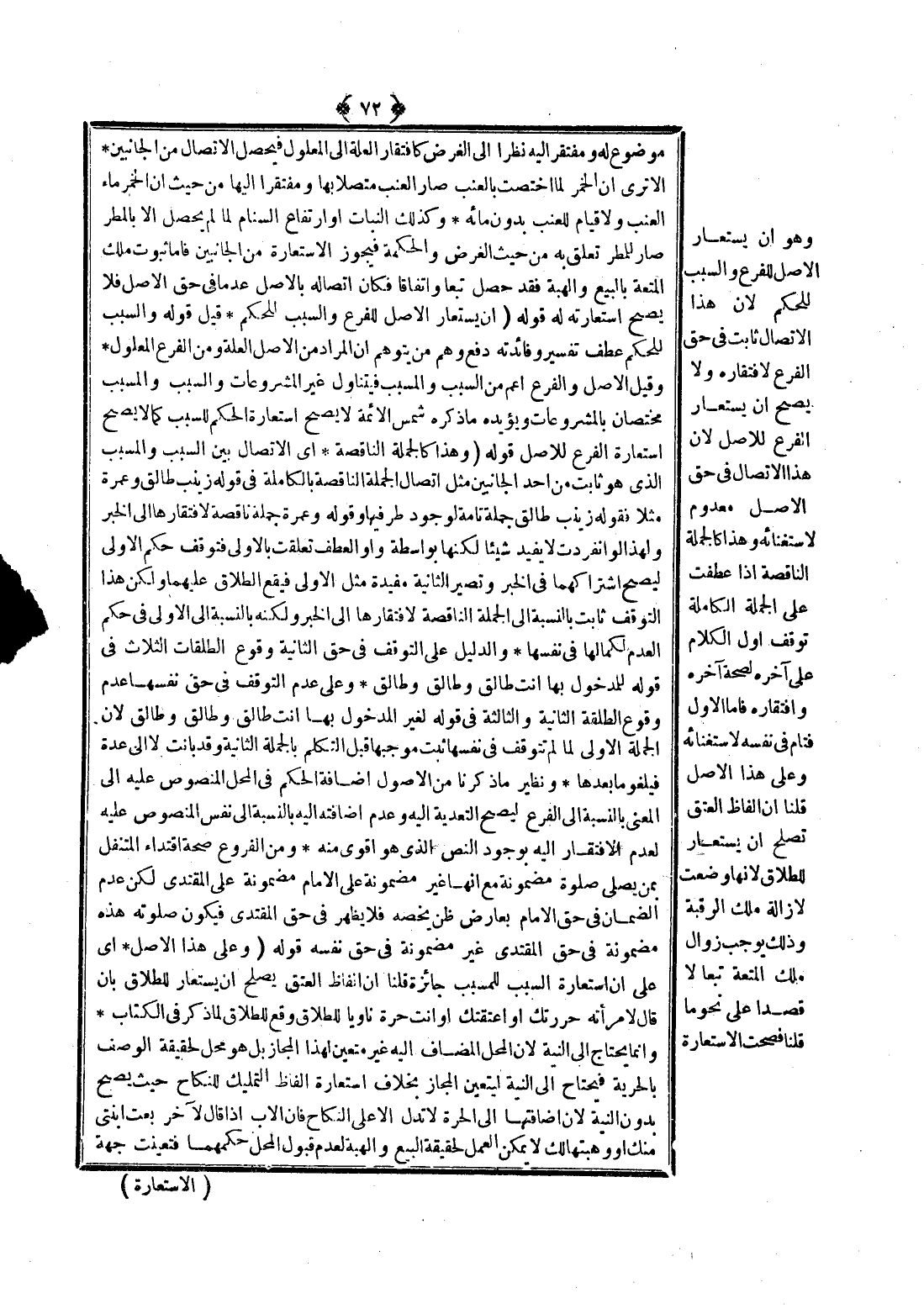 ـــــــــــــــــــــــــــــQمَوْضُوعٌ لَهُ وَمُفْتَقِرٌ إلَيْهِ نَظَرًا إلَى الْغَرَضِ كَافْتِقَارِ الْعِلَّةِ إلَى الْمَعْلُولِ فَيَحْصُلُ الِاتِّصَالُ مِنْ الْجَانِبَيْنِ. أَلَا تَرَى أَنَّ الْخَمْرَ لَمَّا اخْتَصَّتْ بِالْعِنَبِ صَارَ الْعِنَبُ مُتَّصِلًا بِهَا وَمُفْتَقِرًا إلَيْهَا مِنْ حَيْثُ إنَّ الْخَمْرَ مَاءُ الْعِنَبِ وَلَا قِيَامَ لِلْعِنَبِ بِدُونِ مَائِهِ. وَكَذَلِكَ النَّبَاتُ أَوْ ارْتِفَاعُ السَّنَامِ لَمَّا لَمْ يَحْصُلْ إلَّا بِالْمَطَرِ صَارَ لِلْمَطَرِ تَعَلُّقٌ بِهِ مِنْ حَيْثُ الْغَرَضُ وَالْحِكْمَةُ فَيَجُوزُ الِاسْتِعَارَةُ مِنْ الْجَانِبَيْنِ فَأَمَّا ثُبُوتُ مِلْكِ الْمُتْعَةِ بِالْبَيْعِ وَالْهِبَةِ فَقَدْ حَصَلَ تَبَعًا وَاتِّفَاقًا فَكَانَ اتِّصَالُهُ بِالْأَصْلِ عَدَمًا فِي حَقِّ الْأَصْلِ فَلَا يَصِحُّ اسْتِعَارَتُهُ لَهُ.