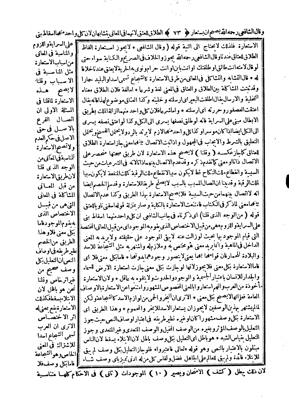 وَلَا تَصِحُّ الِاسْتِعَارَةُ لِلْمُنَاسَبَةِ فِي الْمَعَانِي مِنْ الْوَجْهِ الَّذِي قُلْنَا؛ لِأَنَّ طَرِيقَ الِاسْتِعَارَةِ مِنْ قِبَلِ الْمَعَانِي الْمُشَاكِلَةِ فِي الْمَعَانِي الَّتِي هِيَ مِنْ قَبِيلِ الِاخْتِصَاصِ الَّذِي بِهِ يَقُومُ الْمَوْجُودُ فَأَمَّا بِكُلِّ مَعْنًى فَلَا وَهَذَا الطَّرِيقُ مِنْ الْخَصْمِ نَظِيرُ طَرِيقِهِ فِي أَوْصَافِ النَّصِّ أَنَّ التَّعْلِيلَ بِكُلِّ وَصْفٍ صَحِيحٌ مِنْ غَيْرِ أَثَرٍ خَاصٍّ وَقُلْنَا نَحْنُ هُوَ بَاطِلٌ؛ لِأَنَّ الِابْتِلَاءَ يَسْقُطُ فَكَذَلِكَ الِاسْتِعَارَةُ يَقَعُ بِمَعْنًى لَهُ أَثَرُ الِاخْتِصَاصِ أَلَا تَرَى أَنَّ الْعَرَبَ تُسَمِّي الشُّجَاعَ أَسَدًا لِلِاشْتِرَاكِ فِي الْمَعْنَى الْخَاصِّ وَهُوَ الشُّجَاعَةُ فَأَمَّا بِكُلِّ وَصْفٍ فَلَا؛ لِأَنَّ ذَلِكَ يُبْطِلُ (كَشْفَ) الِامْتِحَانِ وَيُصَيِّرُ (10) الْمَوْجُودَاتِ (ثَانِي) فِي الْأَحْكَامِ كُلِّهَا مُتَنَاسِبَةٌ