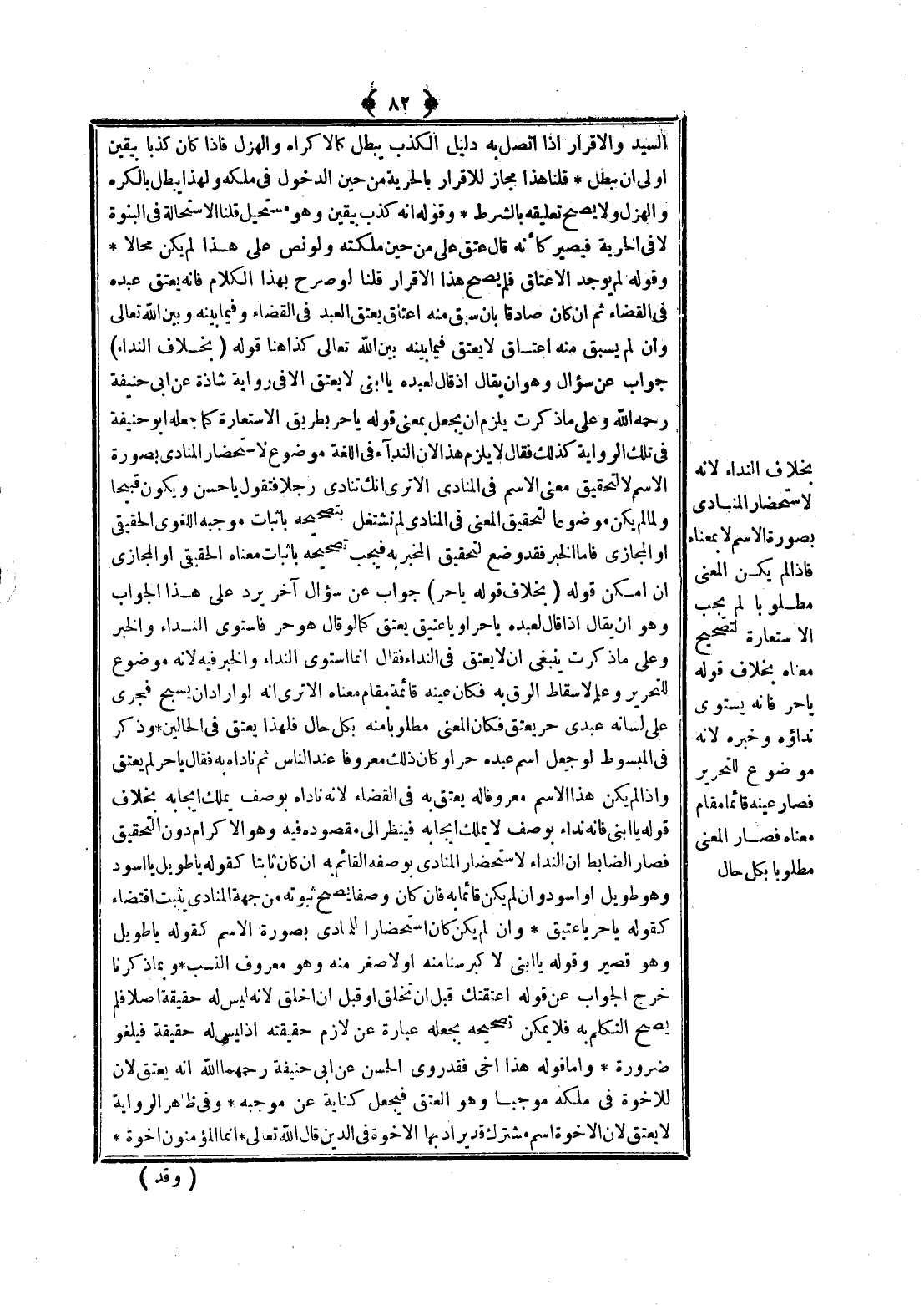 قَوْلُهُ (بِخِلَافِ قَوْلِهِ يَا حُرُّ) جَوَابٌ عَنْ سُؤَالٍ آخَرَ يَرُدُّ عَلَى هَذَا الْجَوَابِ وَهُوَ أَنْ يُقَالَ إذَا قَالَ لِعَبْدِهِ يَا حُرُّ أَوْ يَا عَتِيقُ يَعْتِقُ كَمَا لَوْ قَالَ هُوَ حُرٌّ فَاسْتَوَى النِّدَاءُ وَالْخَبَرُ وَعَلَى مَا ذَكَرْت يَنْبَغِي أَنْ لَا يَعْتِقَ فِي النِّدَاءِ فَقَالَ إنَّمَا اسْتَوَى النِّدَاءُ وَالْخَبَرُ فِيهِ؛ لِأَنَّهُ مَوْضُوعٌ لِلتَّحْرِيرِ وَعَلَمٌ لِإِسْقَاطِ الرِّقِّ بِهِ فَكَأَنَّ عَيْنَهُ قَائِمَةٌ مَقَامَ مَعْنَاهُ، أَلَا تَرَى أَنَّهُ لَوْ أَرَادَ أَنْ يُسَبِّحَ فَجَرَى عَلَى لِسَانِهِ عَبْدِي حُرٌّ يَعْتِقُ فَكَانَ الْمَعْنَى مَطْلُوبًا مِنْهُ بِكُلِّ حَالٍ فَلِهَذَا يَعْتِقُ فِي الْحَالَيْنِ.