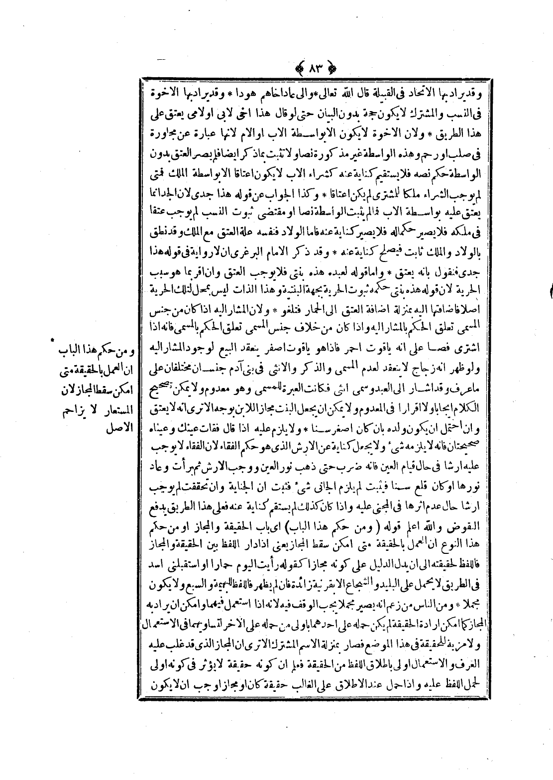 ـــــــــــــــــــــــــــــQوَقَدْ يُرَادُ بِهَا الِاتِّحَادُ فِي الْقَبِيلَةِ قَالَ اللَّهُ تَعَالَى {وَإِلَى عَادٍ أَخَاهُمْ هُودًا} [الأعراف: 65] وَقَدْ يُرَادُ بِهَا الْأُخُوَّةُ فِي النَّسَبِ وَالْمُشْتَرَكِ لَا يَكُونُ حُجَّةً بِدُونِ الْبَيَانِ حَتَّى لَوْ قَالَ هَذَا أَخِي لِأَبِي أَوْ لِأُمِّي يَعْتِقُ عَلَى هَذَا الطَّرِيقِ وَلِأَنَّ الْأُخُوَّةَ لَا يَكُونُ إلَّا بِوَاسِطَةِ الْأَبِ أَوْ الْأُمِّ؛ لِأَنَّهَا عِبَارَةٌ عَنْ مُجَاوِرَةٍ فِي صُلْبٍ أَوْ رَحِمٍ وَهَذِهِ الْوَاسِطَةُ غَيْرُ مَذْكُورَةٍ نَصًّا وَلَا تَثْبُتُ بِمَا ذُكِرَ أَيْضًا فَلَمْ يَصِرْ الْعِتْقُ بِدُونِ الْوَاسِطَةِ حُكْمَ نَصِّهِ فَلَا يَسْتَقِيمُ كِنَايَةً عَنْهُ كَشِرَاءِ الْأَبِ لَا يَكُونُ إعْتَاقًا إلَّا بِوَاسِطَةِ الْمِلْكِ فَمَتَى لَمْ يُوجِبْ الشِّرَاءُ مِلْكًا لِلْمُشْتَرِي لَمْ يَكُنْ إعْتَاقًا.