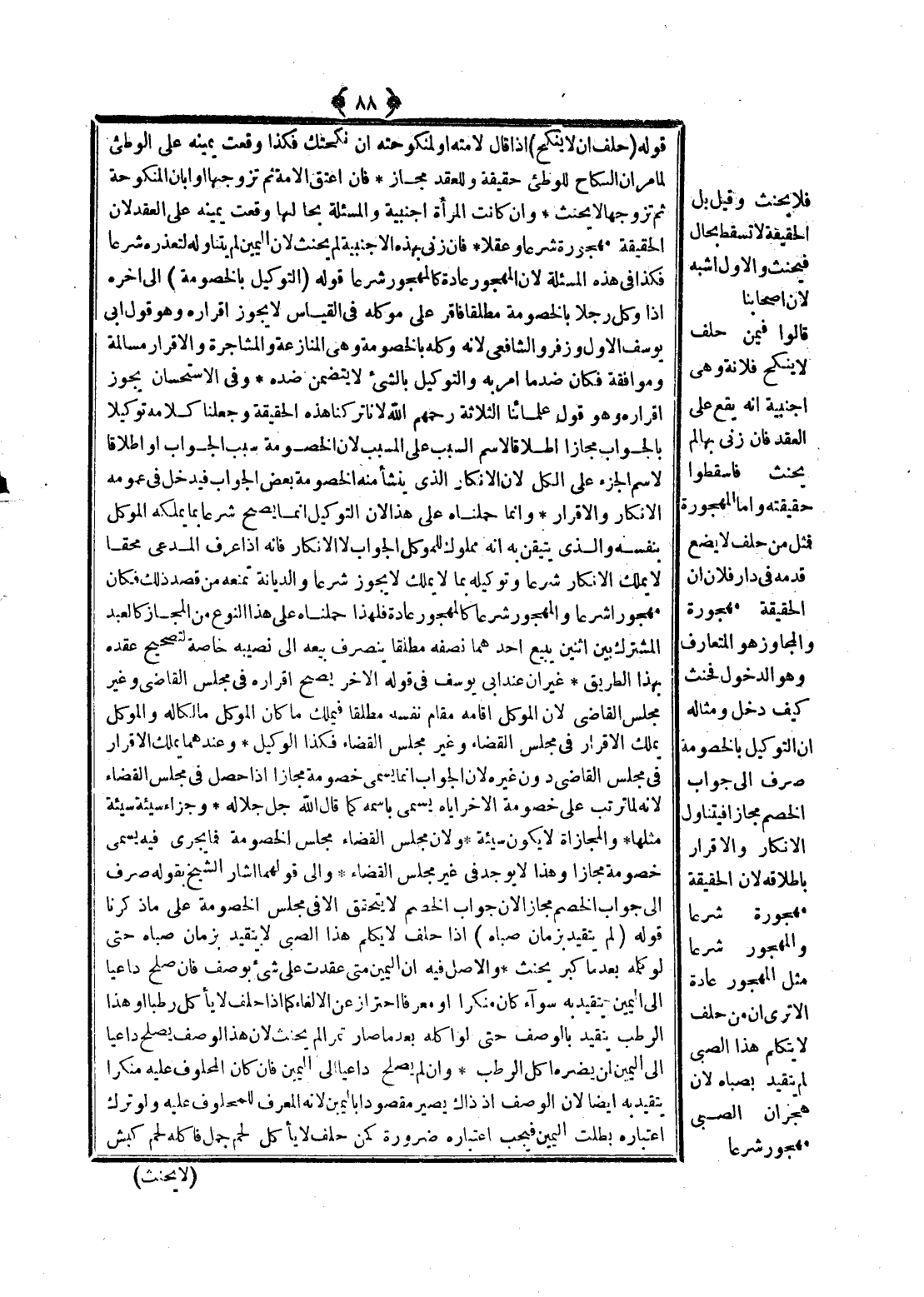 وَفِي الِاسْتِحْسَانِ يَجُوزُ إقْرَارُهُ وَهُوَ قَوْلُ عُلَمَائِنَا الثَّلَاثَةِ - رَحِمَهُمُ اللَّهُ -؛ لِأَنَّا تَرَكْنَا هَذِهِ الْحَقِيقَةَ وَجَعَلْنَا كَلَامَهُ تَوْكِيلًا بِالْجَوَابِ مَجَازًا إطْلَاقًا لِاسْمِ السَّبَبِ عَلَى الْمُسَبَّبِ؛ لِأَنَّ الْخُصُومَةَ سَبَبُ الْجَوَابِ أَوْ إطْلَاقًا لِاسْمِ الْجُزْءِ عَلَى الْكُلِّ؛ لِأَنَّ الْإِنْكَارَ الَّذِي يَنْشَأُ مِنْهُ الْخُصُومَةُ بَعْضُ الْجَوَابِ فَيَدْخُلُ فِي عُمُومِهِ الْإِنْكَارُ وَالْإِقْرَارُ وَإِنَّمَا حَمَلْنَاهُ عَلَى هَذَا؛ لِأَنَّ التَّوْكِيلَ إنَّمَا يَصِحُّ شَرْعًا بِمَا يَمْلِكُهُ الْمُوَكِّلُ بِنَفْسِهِ وَاَلَّذِي يُتَيَقَّنُ بِهِ أَنَّهُ مَمْلُوكٌ لِلْمُوَكِّلِ الْجَوَابُ لَا الْإِنْكَارُ فَإِنَّهُ إذَا عُرِفَ الْمُدَّعِي مُحِقًّا لَا يَمْلِكُ الْإِنْكَارَ شَرْعًا وَتَوْكِيلُهُ بِمَا لَا يَمْلِكُ لَا يَجُوزُ شَرْعًا وَالدِّيَانَةُ تَمْنَعُهُ مِنْ قَصْدِ ذَلِكَ فَكَانَ مَهْجُورًا شَرْعًا وَالْمَهْجُورُ شَرْعًا كَالْمَهْجُورِ عَادَةً فَلِهَذَا حَمَلْنَاهُ عَلَى هَذَا النَّوْعِ مِنْ الْمَجَازِ كَالْعَبْدِ الْمُشْتَرَكِ بَيْنَ اثْنَيْنِ بِبَيْعِ أَحَدِهِمَا نِصْفَهُ مُطْلَقًا يَنْصَرِفُ بَيْعُهُ إلَى نَصِيبِهِ خَاصَّةً لِتَصْحِيحِ عَقْدِهِ بِهَذَا الطَّرِيقِ غَيْرَ أَنَّ عِنْدَ أَبِي يُوسُفَ فِي قَوْلِهِ الْآخَرِ يَصِحُّ إقْرَارُهُ فِي مَجْلِسِ الْقَاضِي وَغَيْرِ مَجْلِسِ الْقَاضِي؛ لِأَنَّ الْمُوَكِّلَ أَقَامَهُ مُقَامَ نَفْسِهِ مُطْلَقًا فَيَمْلِكُ مَا كَانَ الْمُوَكِّلُ مَالِكًا لَهُ وَالْمُوَكِّلُ يَمْلِكُ الْإِقْرَارَ فِي مَجْلِسِ الْقَضَاءِ وَغَيْرِ مَجْلِسِ الْقَضَاءِ فَكَذَا الْوَكِيلُ وَعِنْدَهُمَا يَمْلِكُ الْإِقْرَارَ فِي مَجْلِسِ الْقَاضِي دُونَ غَيْرِهِ؛ لِأَنَّ الْجَوَابَ إنَّمَا يُسَمَّى خُصُومَةً مَجَازًا إذَا حَصَلَ فِي مَجْلِسِ الْقَضَاءِ؛ لِأَنَّهُ لَمَّا تَرَتَّبَ عَلَى خُصُومَةِ الْآخَرِ إيَّاهُ يُسَمَّى بِاسْمِهِ كَمَا قَالَ اللَّهُ جَلَّ جَلَالُهُ {وَجَزَاءُ سَيِّئَةٍ سَيِّئَةٌ مِثْلُهَا} [الشورى: 40] وَالْمُجَازَاةُ لَا يَكُونُ سَيِّئَةً وَلِأَنَّ مَجْلِسَ الْقَضَاءِ مَجْلِسُ الْخُصُومَةِ فَمَا يَجْرِي فِيهِ يُسَمَّى خُصُومَةً مَجَازًا وَهَذَا لَا يُوجَدُ فِي غَيْرِ مَجْلِسِ الْقَضَاءِ.