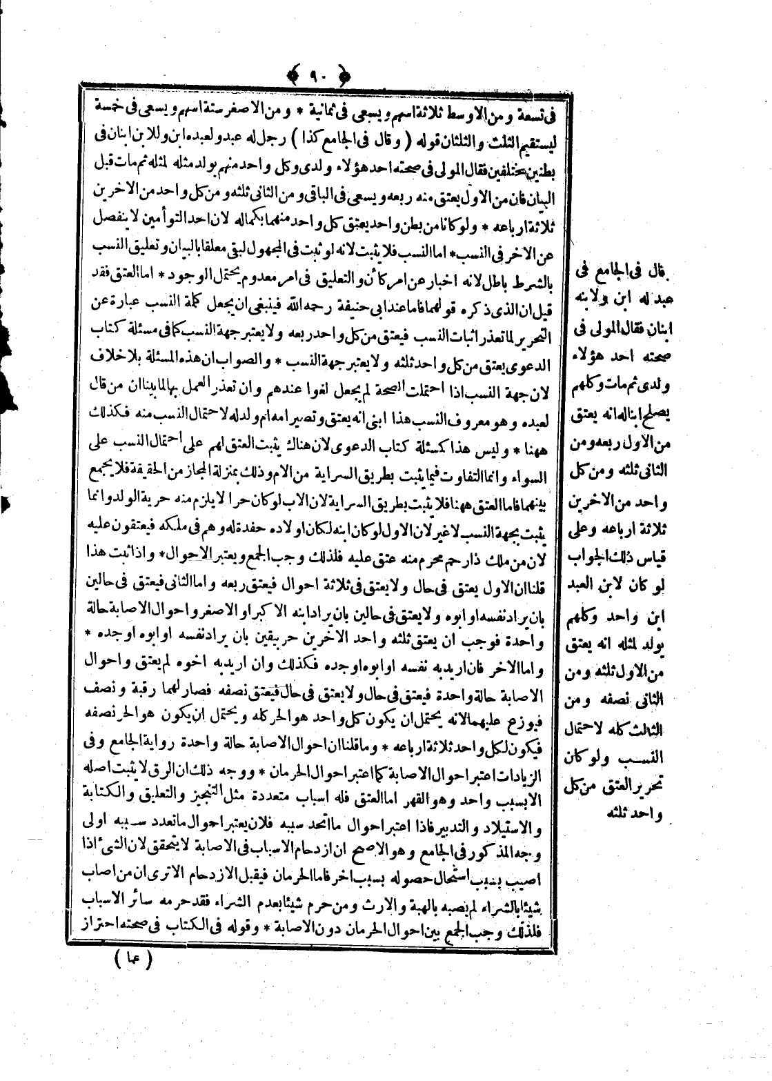 قَالَ فِي الْجَامِعِ فِي عَبْدٍ لَهُ ابْنٌ وَلِابْنِهِ ابْنَانِ فَقَالَ الْمَوْلَى فِي صِحَّتِهِ أَحَدُ هَؤُلَاءِ وَلَدِي ثُمَّ مَاتَ وَكُلُّهُمْ يَصْلُحُ ابْنًا لَهُ أَنَّهُ يَعْتِقُ مِنْ الْأَوَّلِ رُبُعُهُ وَمِنْ الثَّانِي ثُلُثُهُ وَمِنْ كُلِّ وَاحِدٍ مِنْ الْآخَرَيْنِ ثَلَاثَةُ أَرْبَاعِهِ وَعَلَى قِيَاسِ ذَلِكَ الْجَوَابُ لَوْ كَانَ لِابْنِ الْعَبْدِ ابْنٌ وَاحِدٌ وَكُلُّهُمْ يُولَدُ لِمِثْلِهِ أَنَّهُ يَعْتِقُ مِنْ الْأَوَّلِ ثُلُثُهُ وَمِنْ الثَّانِي نِصْفُهُ وَمِنْ الثَّالِثِ كُلُّهُ لِاحْتِمَالِ النَّسَبِ وَلَوْ كَانَ تَحْرِيرُ الْعِتْقِ مِنْ كُلِّ وَاحِدٍ ثُلُثُهُ