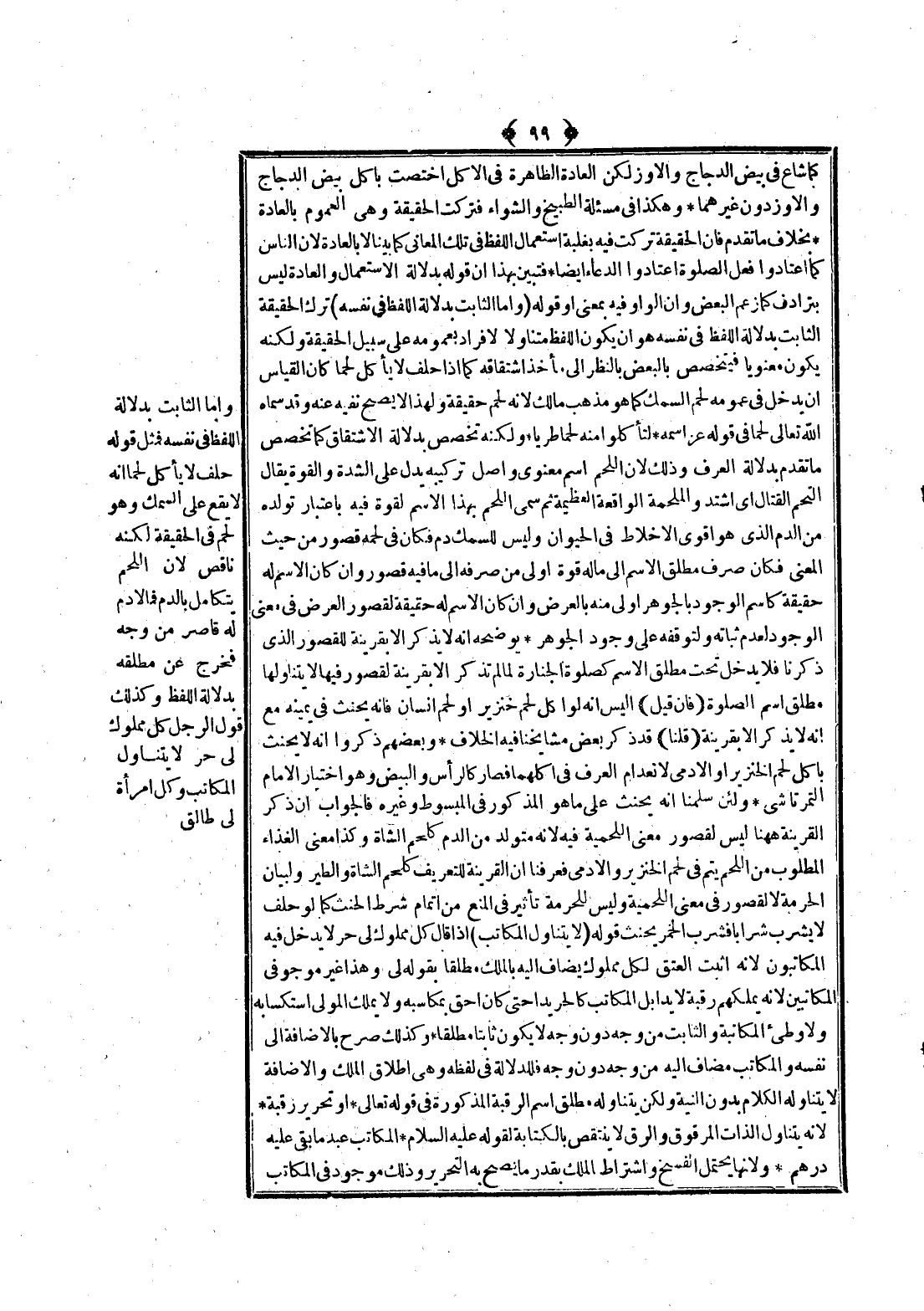 ـــــــــــــــــــــــــــــQكَمَا شَاعَ فِي بَيْضِ الدَّجَاجِ وَالْإِوَزِّ لَكِنَّ الْعَادَةَ الظَّاهِرَةَ فِي الْأَكْلِ اخْتَصَّتْ بِأَكْلِ بَيْضِ الدَّجَاجِ وَالْإِوَزِّ دُونَ غَيْرِهِمَا. وَهَكَذَا فِي مَسْأَلَةِ الطَّبِيخِ وَالشِّوَاءِ فَتُرِكَتْ الْحَقِيقَةُ وَهِيَ الْعُمُومُ بِالْعَادَةِ. بِخِلَافِ مَا تَقَدَّمَ فَإِنَّ الْحَقِيقَةَ تُرِكَتْ فِيهِ بِغَلَبَةِ اسْتِعْمَالِ اللَّفْظِ فِي تِلْكَ الْمَعَانِي كَمَا بَيَّنَّا لَا بِالْعَادَةِ لِأَنَّ النَّاسَ كَمَا اعْتَادُوا فِعْلَ الصَّلَاةِ اعْتَادُوا الدُّعَاءَ أَيْضًا. فَتَبَيَّنَ بِهَذَا أَنَّ قَوْلَهُ بِدَلَالَةِ الِاسْتِعْمَالِ وَالْعَادَةِ لَيْسَ بِتَرَادُفٍ كَمَا زَعَمَ الْبَعْضُ وَأَنَّ الْوَاوَ فِيهِ بِمَعْنَى أَوْ.