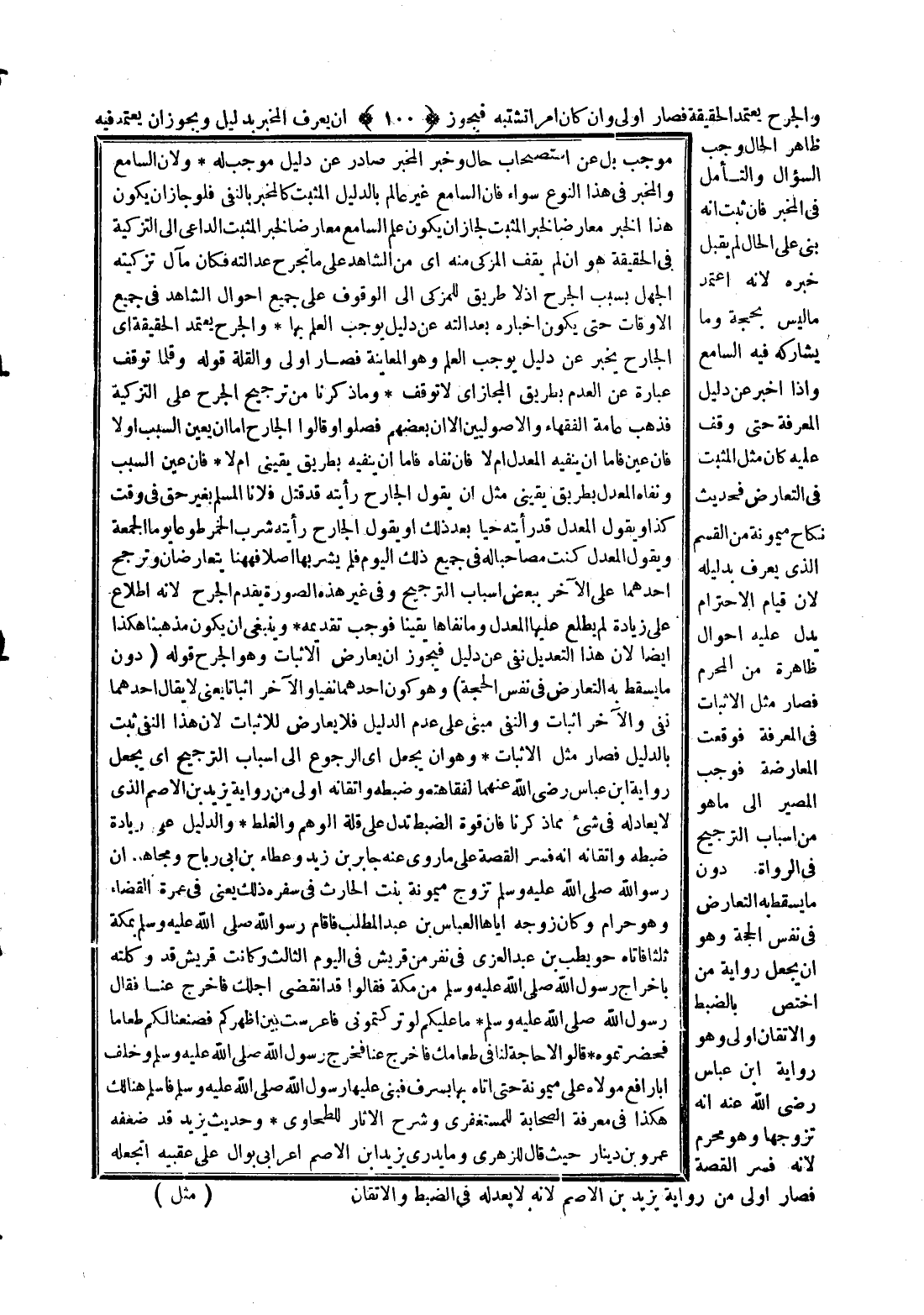 وَمَا ذَكَرْنَا مِنْ تَرْجِيحِ الْجَرْحِ عَلَى التَّزْكِيَةِ مَذْهَبُ عَامَّةِ الْفُقَهَاءِ وَالْأُصُولِيِّينَ إلَّا أَنَّ بَعْضَهُمْ فَصَّلُوا وَقَالُوا الْجَارِحُ إمَّا أَنْ يُعَيِّنَ السَّبَبَ أَوْ لَا فَإِنْ عَيَّنَ فَإِمَّا أَنْ يَنْفِيَهُ الْمُعَدِّلُ أَمْ لَا فَإِنْ نَفَاهُ فَإِمَّا أَنْ يَنْفِيَهُ بِطَرِيقٍ يَقِينِيٍّ أَمْ لَا، فَإِنْ عَيَّنَ السَّبَبَ وَنَفَاهُ الْمُعَدِّلُ بِطَرِيقٍ يَقِينِيٍّ مِثْلَ أَنْ يَقُولَ الْجَارِحُ رَأَيْتُهُ قَدْ قَتَلَ فُلَانًا الْمُسْلِمَ بِغَيْرِ حَقٍّ فِي وَقْتِ كَذَا وَيَقُولَ الْمُعَدِّلُ قَدْ رَأَيْتُهُ حَيًّا بَعْدَ ذَلِكَ أَوْ يَقُولَ الْجَارِحُ رَأَيْتُهُ شَرِبَ الْخَمْرَ طَوْعًا يَوْمَ الْجُمُعَةِ وَيَقُولَ الْمُعَدِّلُ كُنْت مُصَاحِبًا لَهُ فِي جَمِيعِ ذَلِكَ الْيَوْمِ فَلَمْ يُشْرِبْهَا أَصْلًا فَهَهُنَا يَتَعَارَضَانِ وَيُرَجَّحُ أَحَدُهُمَا عَلَى الْآخَرِ بِبَعْضِ أَسْبَابِ التَّرْجِيحِ وَفِي غَيْرِ هَذِهِ الصُّورَةِ يُقَدَّمُ الْجَرْحُ؛ لِأَنَّهُ اطِّلَاعٌ عَلَى زِيَادَةٍ لَمْ يَطَّلِعْ عَلَيْهَا الْمُعَدِّلُ وَمَا نَفَاهَا يَقِينًا فَوَجَبَ تَقْدِيمُهُ، وَيَنْبَغِي أَنْ يَكُونَ مَذْهَبُنَا هَكَذَا أَيْضًا؛ لِأَنَّ هَذَا التَّعْدِيلَ نَفْيٌ عَنْ دَلِيلٍ فَيَجُوزُ أَنْ يُعَارِضَ الْإِثْبَاتَ وَهُوَ الْجَرْحُ، قَوْلُهُ (دُونَ مَا يَسْقُطُ بِهِ التَّعَارُضُ فِي نَفْسِ الْحُجَّةِ) وَهُوَ كَوْنُ أَحَدِهِمَا نَفْيًا وَالْآخَرُ إثْبَاتًا يَعْنِي لَا يُقَالُ أَحَدُهُمَا نَفْيٌ وَالْآخَرُ إثْبَاتٌ وَالنَّفْيُ مَبْنِيٌّ عَلَى عَدَمِ الدَّلِيلِ فَلَا يُعَارِضُ لِلْإِثْبَاتِ؛ لِأَنَّ هَذَا النَّفْيَ ثَبَتَ بِالدَّلِيلِ فَصَارَ مِثْلَ الْإِثْبَاتِ. وَهُوَ أَنْ يُجْعَلَ أَيْ الرُّجُوعُ إلَى أَسْبَابِ التَّرْجِيحِ أَيْ يُجْعَلَ رِوَايَةُ ابْنِ عَبَّاسٍ - رَضِيَ اللَّهُ عَنْهُمَا - لِفَقَاهَتِهِ وَضَبْطِهِ وَإِتْقَانِهِ أَوْلَى مِنْ رِوَايَةِ يَزِيدَ بْنِ الْأَصَمِّ الَّذِي لَا يُعَادِلُهُ فِي شَيْءٍ مِمَّا ذَكَرْنَا فَإِنَّ قُوَّةَ الضَّبْطِ تَدُلُّ عَلَى قِلَّةِ الْوَهْمِ وَالْغَلَطِ، وَالدَّلِيلُ عَلَى زِيَادَةِ ضَبْطِهِ وَإِتْقَانِهِ أَنَّهُ فَسَّرَ الْقِصَّةَ عَلَى مَا رَوَى عَنْهُ جَابِرُ بْنُ زَيْدٍ وَعَطَاءُ بْنُ أَبِي رَبَاحٍ وَمُجَاهِدٌ أَنَّ «رَسُولَ اللَّهِ - صَلَّى اللَّهُ عَلَيْهِ وَسَلَّمَ - تَزَوَّجَ مَيْمُونَةَ بِنْتَ الْحَارِثِ فِي سَفَرِهِ ذَلِكَ يَعْنِي فِي عُمْرَةِ الْقَضَاءِ وَهُوَ حَرَامٌ. وَكَانَ زَوَّجَهُ أَيَّاهَا الْعَبَّاسُ بْنُ عَبْدِ الْمُطَّلِبِ فَأَقَامَ رَسُولُ اللَّهِ - صَلَّى اللَّهُ عَلَيْهِ وَسَلَّمَ - بِمَكَّةَ ثَلَاثًا فَأَتَاهُ حُوَيْطِبُ بْنُ عَبْدِ الْعُزَّى فِي نَفَرٍ مِنْ قُرَيْشٍ فِي الْيَوْمِ الثَّالِثِ وَكَانَتْ قُرَيْشٌ قَدْ وَكَّلَتْهُ بِإِخْرَاجِ رَسُولِ اللَّهِ - صَلَّى اللَّهُ عَلَيْهِ وَسَلَّمَ - مِنْ مَكَّةَ فَقَالُوا قَدْ انْقَضَى أَجَلُك فَاخْرُجْ عَنَّا فَقَالَ رَسُولُ اللَّهِ - صَلَّى اللَّهُ عَلَيْهِ وَسَلَّمَ - مَا عَلَيْكُمْ لَوْ تَرَكْتُمُونِي فَأَعْرَسْتُ بَيْنَ أَظْهُرِكُمْ فَصَنَعْنَا لَكُمْ طَعَامًا فَحَضَرْتُمُوهُ قَالُوا لَا حَاجَةَ لَنَا فِي طَعَامِك فَاخْرُجْ عَنَّا فَخَرَجَ رَسُولُ اللَّهِ - صَلَّى اللَّهُ عَلَيْهِ وَسَلَّمَ - وَخَلَفَ أَبَا رَافِعٍ مَوْلَاهُ عَلَى مَيْمُونَةَ حَتَّى أَتَاهُ بِهَا بِسَرِفٍ فَبَنَى عَلَيْهَا رَسُولُ اللَّهِ - صَلَّى اللَّهُ عَلَيْهِ وَسَلَّمَ - فَأَسْلَمَ هُنَالِكَ» هَكَذَا فِي مَعْرِفَةِ الصَّحَابَةِ لِلْمُسْتَغْفِرَيَّ وَشَرْحِ الْآثَارِ لِلطَّحَاوِيِّ، وَحَدِيثُ يَزِيدَ قَدْ ضَعَّفَهُ عَمْرُو بْنُ دِ