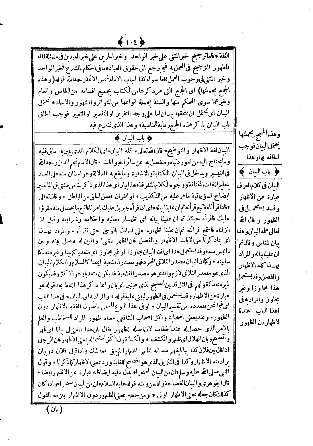 (بَابُ الْبَيَانِ) الْبَيَانُ لُغَةً الْإِظْهَارُ وَالتَّوْضِيحُ قَالَ اللَّهُ تَعَالَى {عَلَّمَهُ الْبَيَانَ} [الرحمن: 4] أَيْ الْكَلَامَ الَّذِي يُبَيِّنُ بِهِ مَا فِي قَلْبِهِ وَمَا يَحْتَاجُ إلَيْهِ مِنْ أُمُورِ دُنْيَاهُ وَمُنْفَصِلٌ بِهِ عَنْ سَائِرِ الْحَيَوَانَاتِ.