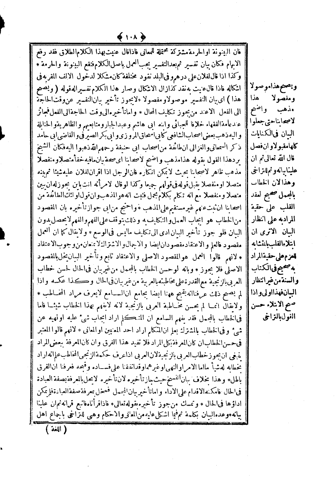 وَبِأَنَّهُ لَوْ حَسُنَ الْخِطَابُ بِالْمُجْمَلِ مِنْ غَيْرِ بَيَانٍ فِي الْحَالِ لَحَسُنَ خِطَابُ الْعَرَبِيِّ بِالزِّنْجِيَّةِ مَعَ الْقُدْرَةِ عَلَى مُخَاطَبَتِهِ بِالْعَرَبِيَّةِ مِنْ غَيْرِ بَيَانٍ فِي الْحَالِ، وَكَذَا عَكْسُهُ، وَإِذَا لَمْ يَصِحَّ ذَلِكَ عَرَفْنَا أَنَّهُ يَقْبُحُ هَاهُنَا أَيْضًا بِجَامِعِ أَنَّ السَّامِعَ لَا يَعْرِفُ مُرَادَ الْمُخَاطِبِ، وَلَا يُقَالُ إنَّمَا لَمْ يَحْسُنْ مُخَاطَبَةُ الْعَرَبِيِّ بِالزِّنْجِيَّةِ؛ لِأَنَّهُ لَا يَفْهَمُ بِهَذَا الْخِطَابِ شَيْئًا، فَأَمَّا فِي الْخِطَابِ بِالْمُجْمَلِ فَقَدْ يَفْهَمُ السَّامِعُ أَنَّ الْمُتَكَلِّمَ أَرَادَ إيجَابَ شَيْءٍ عَلَيْهِ أَوْ نَهْيَهُ عَنْ شَيْءٍ وَفِي الْخِطَابِ بِالْمُشْتَرَكِ يُعْلَمُ أَنَّ الْمُتَكَلِّمَ أَرَادَ أَحَدَ الْمَعْنَيَيْنِ أَوْ الْمَعَانِي؛ لِأَنَّهُمْ قَالُوا الْمُعْتَبَرُ فِي حُسْنِ الْخِطَابِ إنْ كَانَ الْمَعْرِفَةُ بِكُلِّ الْمُرَادِ فَلَا تُفِيدُ هَذَا الْفَرْقَ وَإِنْ كَانَ الْمَعْرِفَةُ بِبَعْضِ الْمُرَادِ يَنْبَغِي أَنْ يَجُوزَ خِطَابُ الْعَرَبِيِّ بِالزِّنْجِيَّةِ؛ لِأَنَّ الْعَرَبِيَّ إذَا عَرَفَ حِكْمَةَ الزِّنْجِيِّ الْمُخَاطِبِ عَلِمَ أَنَّهُ أَرَادَ بِخِطَابِهِ لَهُ شَيْئًا مَا، إمَّا الْأَمْرَ أَوْ النَّهْيَ أَوْ غَيْرَهُمَا، وَقَدْ اتَّفَقْنَا عَلَى فَسَادِهِ وَقُبْحِهِ فَعَرَفْنَا أَنَّ الْفَرْقَ بَاطِلٌ وَهَذَا بِخِلَافِ بَيَانِ النَّسْخِ حَيْثُ جَازَ تَأْخِيرُهُ؛ لِأَنَّ تَأْخِيرَهُ لَا يَحِلُّ بِالْمَعْرِفَةِ بِصِفَةِ الْعِبَادَةِ فِي الْحَالِ فَأَمْكَنَهُ الْإِقْدَامُ عَلَى الْأَدَاءِ.