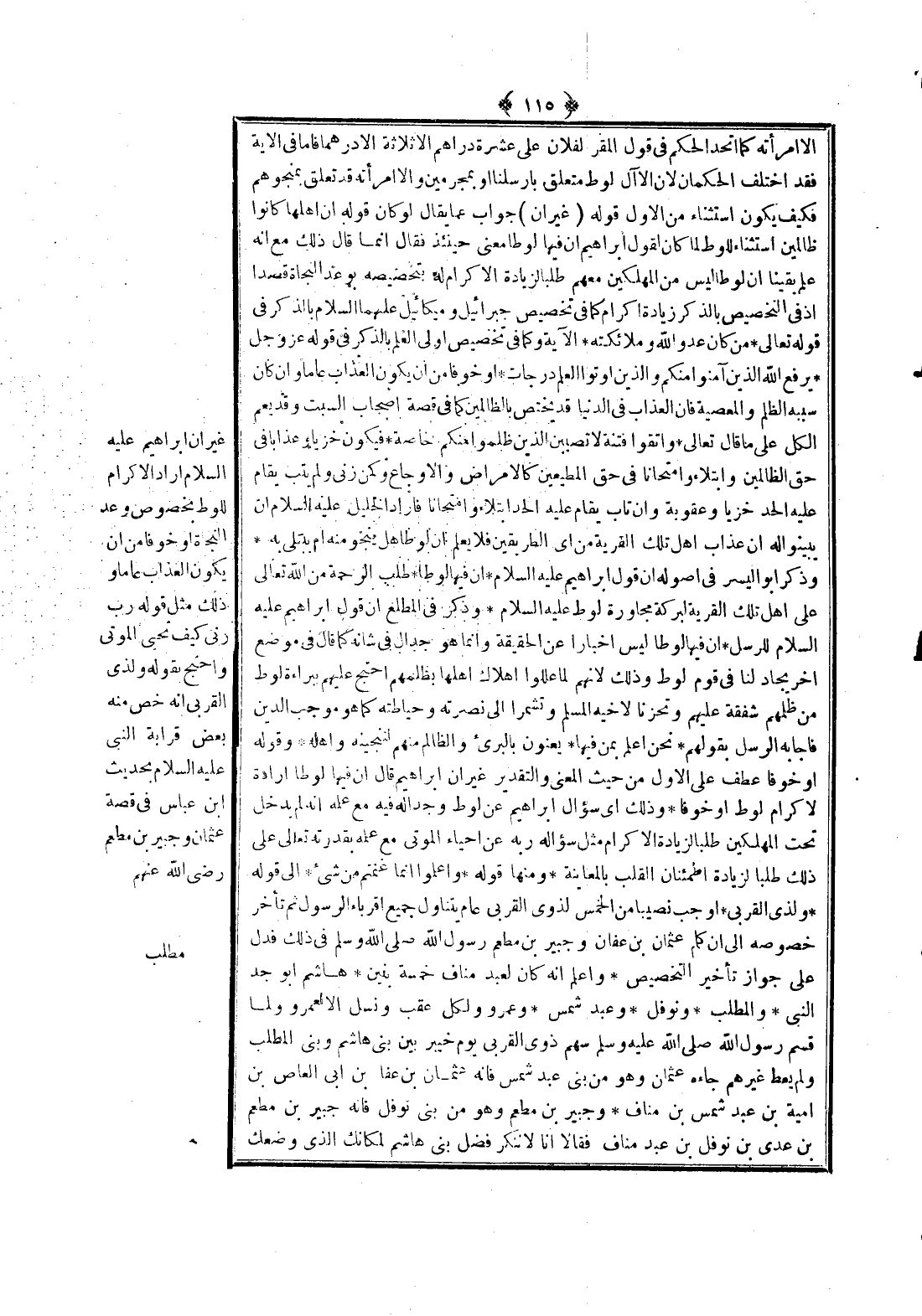 غَيْرَ أَنَّ إبْرَاهِيمَ - عَلَيْهِ السَّلَامُ - أَرَادَ الْإِكْرَامَ لِلُوطٍ بِخُصُوصِ وَعْدِ النَّجَاةِ أَوْ خَوْفًا مِنْ أَنْ يَكُونَ الْعَذَابُ عَامًّا وَذَلِكَ مِثْلُ قَوْلِهِ {رَبِّ أَرِنِي كَيْفَ تُحْيِ الْمَوْتَى} [البقرة: 260] وَاحْتَجَّ بِقَوْلِهِ {وَلِذِي الْقُرْبَى} [الأنفال: 41] أَنَّهُ خُصَّ مِنْهُ بَعْضُ قَرَابَةِ النَّبِيِّ - عَلَيْهِ السَّلَامُ - بِحَدِيثِ ابْنِ عَبَّاسٍ فِي قِصَّةِ عُثْمَانَ وَجُبَيْرِ بْنِ مُطْعِمٍ - رَضِيَ اللَّهُ عَنْهُمْ -