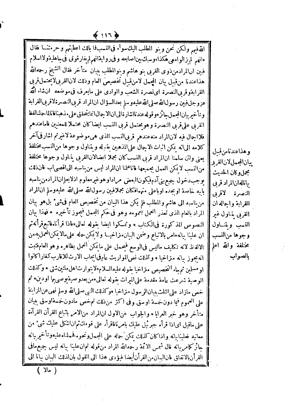 ـــــــــــــــــــــــــــــQاللَّهُ فِيهِمْ وَلَكِنْ نَحْنُ وَبَنُو الْمُطَّلِبِ إلَيْك سَوَاءٌ فِي النَّسَبِ فَمَا بَالُك أَعْطَيْتَهُمْ وَحَرَمْتَنَا؟ فَقَالَ إنَّهُمْ لَمْ يَزَالُوا مَعِي هَكَذَا وَشَبَّكَ بَيْنَ أَصَابِعِهِ» وَفِي رِوَايَةٍ «إنَّهُمْ لَمْ يُفَارِقُونِي فِي جَاهِلِيَّةٍ وَلَا إسْلَامٍ» فَبَيَّنَ أَنَّ الْمُرَادَ مِنْ ذَوِي الْقُرْبَى بَنُو هَاشِمٍ وَبَنُو الْمُطَّلِبِ بِبَيَانٍ مُتَأَخِّرٍ فَقَالَ الشَّيْخُ - رَحِمَهُ اللَّهُ - هَذَا عِنْدَنَا مِنْ قَبِيلِ بَيَانِ الْمُجْمَلِ لَا مِنْ قَبِيلِ تَخْصِيصِ الْعَامِّ، وَذَلِكَ لِأَنَّ الْقُرْبَى لَا يَحْتَمِلُ قُرْبَى الْقَرَابَةِ وَقُرْبَى النُّصْرَةِ أَيْ نُصْرَةِ الشِّعْبِ وَالْوَادِي عَلَى مَا يُعْرَفُ فِي مَوْضِعِهِ إنْ شَاءَ اللَّهُ عَزَّ وَجَلَّ فَبَيَّنَ رَسُولُ اللَّهِ - صَلَّى اللَّهُ عَلَيْهِ وَسَلَّمَ - بَعْدَ السُّؤَالِ أَنَّ الْمُرَادَ قُرْبَى النُّصْرَةِ لَا قُرْبَى الْقَرَابَةِ وَتَأْخِيرُ بَيَانِ الْمُجْمَلِ جَائِزٌ.