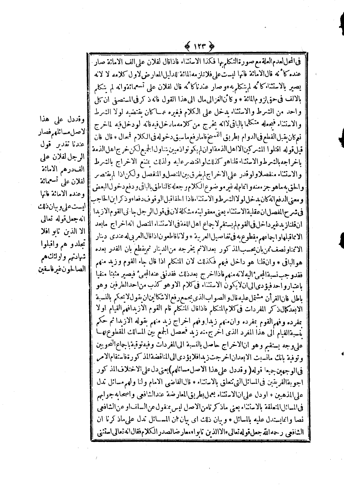وَقَدْ دَلَّ عَلَى هَذَا الْأَصْلِ مَسَائِلُهُمْ فَصَارَ عِنْدَنَا تَقْدِيرُ قَوْلِ الرَّجُلِ لِفُلَانٍ عَلَيَّ أَلْفُ دِرْهَمٍ إلَّا مِائَةً لِفُلَانٍ عَلَيَّ تِسْعُمِائَةٍ وَعِنْدَهُ إلَّا مِائَةً فَإِنَّهَا لَيْسَتْ عَلَيَّ وَبَيَانُ ذَلِكَ أَنَّهُ جَعَلَ قَوْله تَعَالَى {إِلا الَّذِينَ تَابُوا} [النور: 5] فَلَا تَجْلِدُوهُمْ وَاقْبَلُوا شَهَادَتَهُمْ وَأُولَئِكَ هُمْ الصَّالِحُونَ غَيْرُ فَاسْقِينَ