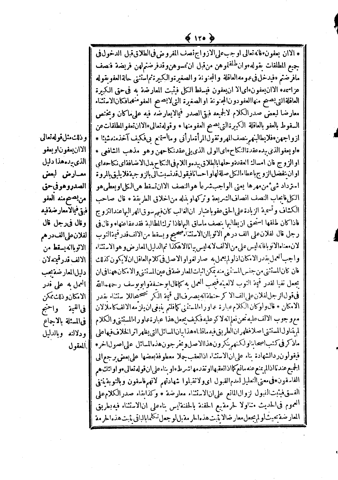 قَالَ صَاحِبُ الْكَشَّافِ وَتَسْمِيَةُ الزِّيَادَةِ عَلَى الْحَقِّ عَفْوٌ بِاعْتِبَارِ أَنَّ الْغَالِبَ كَانَ فِيهِمْ سَوْقُ الْمَهْرِ إلَيْهَا عِنْدَ التَّزَوُّجِ فَإِذَا كَانَ طَلَّقَهَا اسْتَحَقَّ أَنْ يُطَالِبَهَا بِنِصْفِ مَا سَاقَ إلَيْهَا فَإِذَا تَرَكَ الْمُطَالَبَةَ فَقَدْ عَفَا عَنْهَا وَقَالَ فِي رَجُلٍ قَالَ لِفُلَانٍ عَلَيَّ أَلْفِ دِرْهَمٍ إلَّا ثَوْبًا إنَّ الِاسْتِثْنَاءَ صَحِيحٌ وَيَسْقُطُ مِنْ الْأَلْفِ قَدْرُ قِيمَةِ الثَّوْبِ؛ لِأَنَّ مَعْنَاهُ إلَّا ثَوْبًا فَإِنَّهُ لَيْسَ عَلَيَّ مِنْ الْأَلْفِ؛ لِأَنَّهُ لَيْسَ بَيَانًا إلَّا هَكَذَا، ثُمَّ الدَّلِيلُ الْمُعَارِضُ وَهُوَ الِاسْتِثْنَاءُ وَاجِبُ الْعَمَلِ بِقَدْرِ الْإِمْكَانِ إذْ لَوْ لَمْ يُعْمَلْ بِهِ صَارَ لَغْوًا وَالْأَصْلُ فِي كَلَامِ الْعَاقِلِ أَنْ لَا يَكُونَ كَذَلِكَ، فَإِنْ كَانَ الْمُسْتَثْنَى مِنْ جِنْسِ الْمُسْتَثْنَى مِنْهُ يُمْكِنُ إثْبَاتُ الْمُعَارَضَةِ فِي عَيْنِ الْمُسْتَثْنَى وَالْإِمْكَانُ هَاهُنَا فِي أَنْ يُجْعَلَ نَفْيًا لِقَدْرِ قِيمَةِ الثَّوْبِ لَا لِعَيْنِهِ فَيَجِبُ الْعَمَلُ بِهِ كَمَا قَالَ أَبُو حَنِيفَةَ وَأَبُو يُوسُفَ رَحِمَهُمَا اللَّهُ فِي قَوْلِ الرَّجُلِ لِفُلَانٍ عَلَيَّ أَلْفٌ إلَّا كُرَّ حِنْطَةٍ أَنَّهُ يُصْرَفُ إلَى قِيمَةِ الْكُرِّ تَصْحِيحًا لِلِاسْتِثْنَاءِ بِقَدْرِ الْإِمْكَانِ.