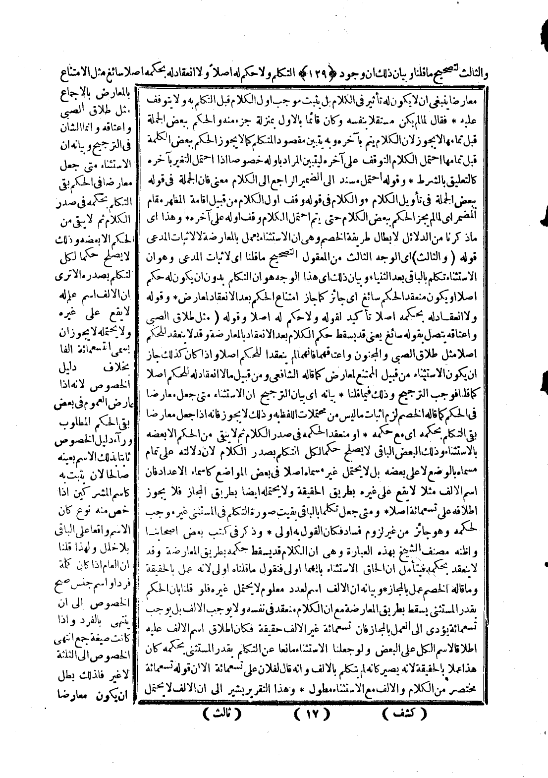 وَالثَّالِثُ لِتَصْحِيحِ مَا قُلْنَا وَبَيَانُ ذَلِكَ أَنَّ وُجُودَ التَّكَلُّمِ وَلَا حُكْمَ لَهُ أَصْلًا وَلَا انْعِقَادَ لَهُ بِحُكْمِهِ أَصْلًا سَائِغٌ مِثْلَ الِامْتِنَاعِ بِالْمُعَارِضِ بِالْإِجْمَاعِ مِثْلَ طَلَاقِ الصَّبِيِّ وَإِعْتَاقِهِ وَإِنَّمَا الشَّأْنُ فِي التَّرْجِيحِ، وَبَيَانُهُ أَنَّ الِاسْتِثْنَاءَ مَتَى جُعِلَ مُعَارِضًا فِي الْحُكْمِ بَقِيَ التَّكَلُّمُ بِحُكْمِهِ فِي صَدْرِ الْكَلَامِ ثُمَّ لَا يَبْقَى مِنْ الْحُكْمِ إلَّا بَعْضُهُ وَذَلِكَ لَا يَصْلُحُ حُكْمًا لِكُلِّ التَّكَلُّمِ بِصَدْرِهِ أَلَا تَرَى أَنَّ الْأَلْفَ اسْمُ عَلَمٍ لَهُ لَا يَقَعُ عَلَى غَيْرِهِ وَلَا يَحْتَمِلُهُ لَا يَجُوزُ أَنْ يُسَمَّى التُّسْعُمِائَةُ أَلْفًا بِخِلَافِ دَلِيلِ الْخُصُوصِ؛ لِأَنَّهُ إذَا عَارَضَ الْعُمُومَ فِي بَعْضٍ بَقِيَ الْحُكْمُ الْمَطْلُوبُ وَرَاءَ دَلِيلِ الْخُصُوصِ ثَابِتًا بِذَلِكَ الِاسْمِ بِعَيْنِهِ صَالِحًا لَأَنْ يَثْبُتَ بِهِ كَاسْمِ الْمُشْرِكِينَ إذَا خُصَّ مِنْهُ نَوْعٌ كَانَ الِاسْمُ وَاقِعًا عَلَى الْبَاقِي بِلَا خَلَلٍ وَلِهَذَا قُلْنَا إنَّ الْعَامَّ إذَا كَانَ كَلِمَةَ فَرْدٍ أَوْ اسْمَ جِنْسٍ صَحَّ الْخُصُوصُ إلَى أَنْ يَنْتَهِيَ بِالْفَرْدِ وَإِذَا كَانَتْ صِيغَةَ جَمْعٍ انْتَهَى الْخُصُوصُ إلَى الثَّلَاثَةِ لَا غَيْرُ فَلِذَلِكَ بَطَلَ أَنْ يَكُونَ مُعَارِضًا