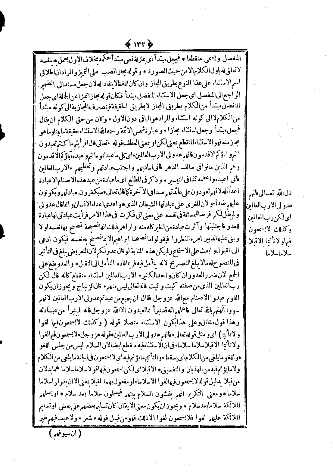 وَكَانَ مِنْ حَقِّ الْكَلَامِ أَنْ يُقَالَ فَجُعِلَ مُبْتَدَأً وَجُعِلَ اسْتِثْنَاءً مَجَازًا وَعِبَارَةُ شَمْسِ الْأَئِمَّةِ - رَحِمَهُ اللَّهُ - الِاسْتِثْنَاءُ حَقِيقَةً مَا بَيَّنَّا وَمَا هُوَ مَجَازٌ مِنْهُ فَهُوَ الِاسْتِثْنَاءُ الْمُنْقَطِعُ بِمَعْنَى لَكِنْ أَوْ بِمَعْنَى الْعَطْفِ قَوْله تَعَالَى {قَالَ أَفَرَأَيْتُمْ مَا كُنْتُمْ تَعْبُدُونَ} [الشعراء: 75] {أَنْتُمْ وَآبَاؤُكُمُ الأَقْدَمُونَ} [الشعراء: 76] {فَإِنَّهُمْ عَدُوٌّ لِي إِلا رَبَّ الْعَالَمِينَ} [الشعراء: 77] أَيْ كُلُّ مَا عَبَدْتُمُوهُ أَنْتُمْ وَعَبَدَهُ آبَاؤُكُمْ الْأَقْدَمُونَ وَهُمْ الَّذِينَ مَاتُوا فِي سَالِفِ الدَّهْرِ فَإِنِّي أُعَادِيهِمْ وَأَجْتَنِبُ عِبَادَتَهُمْ وَتَعْظِيمَهُمْ. إلَّا رَبَّ الْعَالَمِينَ فَإِنِّي أَعْبُدُهُ وَأُعَظِّمُهُ كَذَا فِي التَّيْسِيرِ.