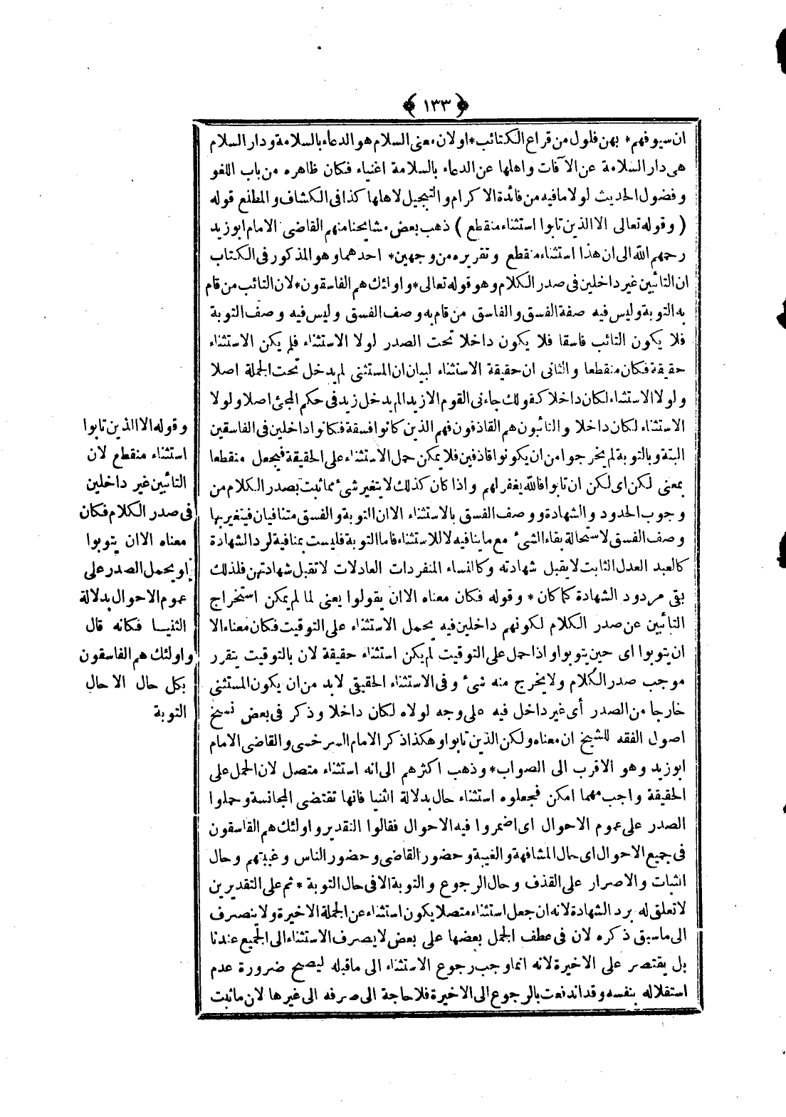 وَإِذَا كَانَ كَذَلِكَ لَا يَتَغَيَّرُ شَيْءٌ مِمَّا ثَبَتَ بِصَدْرِ الْكَلَامِ مِنْ وُجُوبِ الْحُدُودِ وَالشَّهَادَةِ وَوَصْفِ الْفِسْقِ بِالِاسْتِثْنَاءِ إلَّا أَنَّ التَّوْبَةَ وَالْفِسْقَ مُتَنَافِيَانِ فَيَتَغَيَّرُ بِهَا وَصْفُ الْفِسْقِ لِاسْتِحَالَةِ بَقَاءِ الشَّيْءِ مَعَ مَا يُنَافِيهِ لَا لِلِاسْتِثْنَاءِ، فَأَمَّا التَّوْبَةُ فَلَيْسَتْ بِمُنَافِيَةٍ لِرَدِّ الشَّهَادَةِ كَالْعَبْدِ الْعَدْلِ الثَّابِتِ لَا يُقْبَلُ شَهَادَتُهُ وَكَالنِّسَاءِ الْمُنْفَرِدَاتِ الْعَادِلَاتِ لَا تُقْبَلُ شَهَادَتُهُنَّ فَلِذَلِكَ بَقِيَ مَرْدُودَ الشَّهَادَةِ كَمَا كَانَ وَقَوْلُهُ فَكَانَ مَعْنَاهُ إلَّا أَنْ يَتُوبُوا يَعْنِي لَمَّا لَمْ يُمْكِنْ اسْتِخْرَاجُ التَّائِبِينَ عَنْ صَدْرِ الْكَلَامِ لِكَوْنِهِمْ دَاخِلِينَ فِيهِ يُحْمَلُ الِاسْتِثْنَاءُ عَلَى التَّوْقِيتِ فَكَانَ مَعْنَاهُ إلَّا أَنْ يَتُوبُوا أَيْ حِينَ يَتُوبُوا، وَإِذَا حُمِلَ عَلَى التَّوْقِيتِ لَمْ يَكُنْ اسْتِثْنَاءً حَقِيقَةً؛ لِأَنَّ بِالتَّوْقِيتِ يَتَقَرَّرُ مُوجَبُ صَدْرِ الْكَلَامِ وَلَا يَخْرُجُ مِنْهُ شَيْءٌ وَفِي الِاسْتِثْنَاءِ الْحَقِيقِيِّ لَا بُدَّ مِنْ أَنْ يَكُونَ الْمُسْتَثْنَى خَارِجًا مِنْ الصَّدْرِ أَيْ غَيْرَ دَاخِلٍ فِيهِ عَلَى وَجْهٍ لَوْلَاهُ لَكَانَ دَاخِلًا وَذُكِرَ فِي بَعْضِ نُسَخِ أُصُولِ الْفِقْهِ لِلشَّيْخِ أَنَّ مَعْنَاهُ وَلَكِنْ الَّذِينَ تَابُوا، وَهَكَذَا ذَكَرَ الْإِمَامُ السَّرَخْسِيُّ وَالْقَاضِي الْإِمَامُ أَبُو زَيْدٍ وَهُوَ الْأَقْرَبُ إلَى الصَّوَابِ وَذَهَبَ أَكْثَرُهُمْ إلَى أَنَّهُ اسْتِثْنَاءٌ مُتَّصِلٌ؛ لِأَنَّ الْحَمْلَ عَلَى الْحَقِيقَةِ وَاجِبٌ مَهْمَا أَمْكَنَ فَجَعَلُوهُ اسْتِثْنَاءَ حَالٍ بِدَلَالَةِ الثُّنْيَا فَإِنَّهَا تَقْتَضِي الْمُجَانَسَةَ وَحَمَلُوا الصَّدْرَ عَلَى عُمُومِ الْأَحْوَالِ أَيْ أَضْمَرُوا فِيهِ الْأَحْوَالَ فَقَالُوا التَّقْدِيرُ وَأُولَئِكَ هُمْ الْفَاسِقُونَ فِي جَمِيعِ الْأَحْوَالِ أَيْ حَالَ الْمُشَافَهَةِ وَالْغَيْبَةِ وَحُضُورِ الْقَاضِي وَحُضُورِ النَّاسِ وَغَيْبَتِهِمْ وَحَالَ الثَّبَاتِ وَالْإِصْرَارِ عَلَى الْقَذْفِ وَحَالَ الرُّجُوعِ وَالتَّوْبَةِ إلَّا فِي حَالِ التَّوْبَةِ.