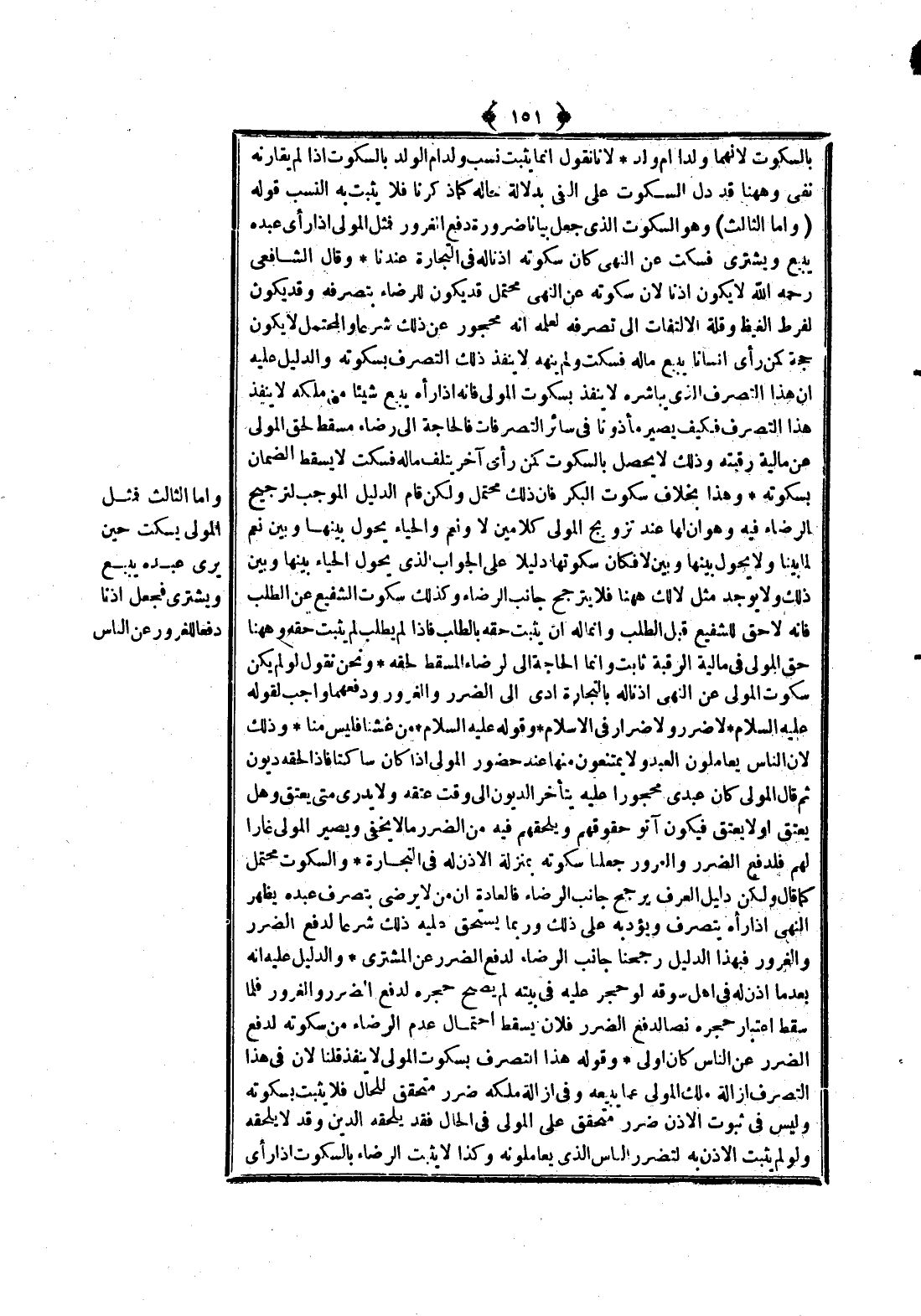 وَالسُّكُوتُ مُحْتَمِلٌ كَمَا قَالَ وَلَكِنَّ دَلِيلَ الْعُرْفِ يُرَجِّحُ جَانِبَ الرِّضَاءِ فَالْعَادَةُ أَنَّ مَنْ لَا يَرْضَى بِتَصَرُّفِ عَبْدِهِ يُظْهِرُ النَّهْيَ إذَا رَآهُ يَتَصَرَّفُ وَيُؤَدِّبُهُ عَلَى ذَلِكَ وَرُبَّمَا يَسْتَحِقُّ عَلَيْهِ ذَلِكَ شَرْعًا لِدَفْعِ الضَّرَرِ وَالْغُرُورِ فَبِهَذَا الدَّلِيلِ رَجَّحْنَا جَانِبَ الرِّضَا لِدَفْعِ الضَّرَرِ عَنْ الْمُشْتَرِي وَالدَّلِيلُ عَلَيْهِ أَنَّهُ بَعْدَمَا أَذِنَ لَهُ فِي أَهْلِ سُوقِهِ لَوْ حَجَرَ عَلَيْهِ فِي بَيْتِهِ لَمْ يَصِحَّ حَجْرُهُ لِدَفْعِ الضَّرَرِ وَالْغُرُورِ فَلَمَّا سَقَطَ اعْتِبَارُ حَجْرِهِ نَصًّا لِدَفْعِ الضَّرَرِ فَلَأَنْ يَسْقُطَ احْتِمَالُ عَدَمِ الرِّضَاءِ مِنْ سُكُوتِهِ لِدَفْعِ الضَّرَرِ عَنْ النَّاسِ كَانَ أَوْلَى وَقَوْلُهُ هَذَا التَّصَرُّفُ بِسُكُوتِ الْمَوْلَى لَا يَنْفُذُ قُلْنَا: لِأَنَّ فِي هَذَا التَّصَرُّفِ إزَالَةَ مِلْكِ الْمَوْلَى عَمَّا يَبِيعُهُ وَفِي إزَالَةِ مِلْكِهِ ضَرَرٌ مُتَحَقِّقٌ لِلْحَالِ فَلَا يَثْبُتُ بِسُكُوتِهِ وَلَيْسَ فِي ثُبُوتِ الْإِذْنِ ضَرَرٌ مُتَحَقِّقٌ عَلَى الْمَوْلَى فِي الْحَالِ فَقَدْ يَلْحَقُهُ الدَّيْنُ وَقَدْ لَا يَلْحَقُهُ وَلَوْ لَمْ يَثْبُتْ الْإِذْنُ بِهِ لِتَضَرُّرِ النَّاسِ الَّذِي يُعَامِلُونَهُ وَكَذَا لَا يَثْبُتُ الرِّضَاءُ بِالسُّكُوتِ إذَا رَأَى