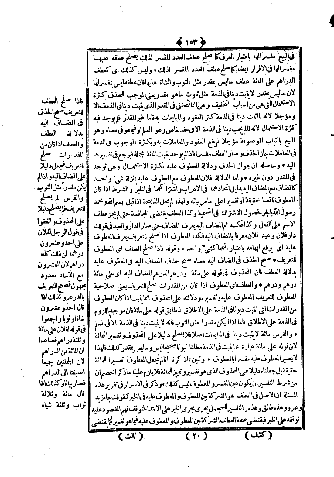 فَإِذَا صَلَحَ الْعَطْفُ لِلتَّعْرِيفِ صَحَّ الْحَذْفُ فِي الْمُضَافِ إلَيْهِ بِدَلَالَةِ الْعَطْفِ وَالْعَطْفُ إذَا كَانَ مِنْ الْمُقَدَّرَاتِ صَلَحَ لِلتَّعْرِيفِ فَجُعِلَ دَلِيلًا عَلَى الْمُضَافِ إلَيْهِ وَإِذَا لَمْ يَكُنْ مُقَدَّرًا مِثْلُ الثَّوْبِ وَالْفَرَسِ لَمْ يَصْلُحْ لِلتَّعْرِيفِ فَلَمْ يَصْلُحُ دَلِيلًا عَلَى الْمَحْذُوفِ وَاتَّفَقُوا فِي قَوْلِ الرَّجُلِ: لِفُلَانٍ عَلَيَّ أَحَدٌ وَعِشْرُونَ دِرْهَمًا أَنَّ ذَلِكَ كُلَّهُ دَرَاهِمُ؛ لِأَنَّ الْعِشْرُونَ مَعَ الْآحَادِ مَعْدُودٌ مَجْهُولٌ فَصَحَّ التَّعْرِيفُ بِالدِّرْهَمِ وَكَذَلِكَ إذَا قَالَ أَحَدٌ وَعِشْرُونَ شَاةً أَوْ ثَوْبًا وَأَجْمَعُوا فِي قَوْلِهِ لِفُلَانٍ عَلَيَّ مِائَةٌ وَثَلَاثَةُ دَرَاهِمَ فَصَاعِدًا أَنَّ الْمِائَةَ مِنْ الدَّرَاهِمِ؛ لِأَنَّ الْجُمْلَتَيْنِ جَمِيعًا أُضِيفَتَا إلَى الدَّرَاهِمِ فَصَارَ بَيَانًا وَكَذَلِكَ إذَا قَالَ مِائَةٌ وَثَلَاثَةُ أَثْوَابٍ وَثَلَاثَةُ شِيَاهٍ
