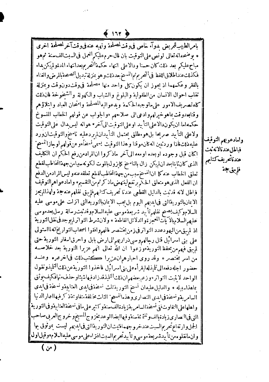 وَأَمَّا دَعْوَاهُمْ التَّوْقِيفَ فَبَاطِلٌ؛ لِأَنَّهُ قَدْ ثَبَتَ بِالدَّلِيلِ الْقَطْعِيِّ عِنْدَنَا تَحْرِيفُ كِتَابِهِمْ فَلَمْ يَبْقَ نَقْلُهُمْ عَنْهُ حُجَّةً وَلِهَذَا لَمْ يَجُزْ الْإِيمَانُ بِالتَّوْرَاةِ الَّتِي فِي أَيْدِيهِمْ الْيَوْمَ بَلْ يَجِبُ الْإِيمَانُ بِالتَّوْرَاةِ الَّتِي أُنْزِلَتْ عَلَى مُوسَى - عَلَيْهِ السَّلَامُ - وَكَيْفَ يَصِحُّ نَقْلُهُمْ تَأْبِيدَ شَرِيعَةِ مُوسَى - عَلَيْهِ السَّلَامُ - وَقَدْ ثَبَتَ رِسَالَةُ رُسُلٍ بَعْدَ مُوسَى - عَلَيْهِ السَّلَامُ - بِالْآيَاتِ الْمُعْجِزَةِ وَالدَّلَائِلِ الْقَاطِعَةِ وَلِأَنَّ شَرْطَ التَّوَاتُرِ لَمْ يُوجَدْ فِي نَقْلِ التَّوْرَاةِ إذْ لَمْ يَبْقَ مِنْ الْيَهُودِ عَدَدُ التَّوَاتُرِ فِي زَمَنِ بُخْتِ نَصَّرَ فَإِنَّهُمْ وَافَقُوا أَصْحَابَ التَّوَارِيخِ أَنَّهُ لَمَّا اسْتَوْلَى عَلَى بَنِي إسْرَائِيلَ قَتَلَ رِجَالَهُمْ وَسَبَى ذَرَارِيَّهُمْ إلَى أَرْضِ بَابِلَ وَأَحْرَقَ أَسْفَارَ التَّوْرَاةِ حَتَّى لَمْ يَبْقَ فِيهِمْ مَنْ يَحْفَظُ التَّوْرَاةَ وَزَعَمُوا أَنَّ اللَّهَ تَعَالَى أَلْهَمَ عُزَيْرًا التَّوْرَاةَ بَعْدَ خَلَاصِهِ مِنْ أَسْرِ بُخْتِ نَصَّرَ وَقَدْ رَوَى أَحْبَارُهُمْ أَنَّ عُزَيْرًا كَتَبَ ذَلِكَ فِي آخِرِ عُمْرِهِ وَعِنْدَ حُضُورِ أَجَلِهِ دَفَعَهُ إلَى تِلْمِيذٍ لَهُ لِيَقْرَأَهُ عَلَى بَنِي إسْرَائِيلَ فَأَخَذُوا التَّوْرَاةَ عَنْ ذَلِكَ التِّلْمِيذِ وَنَقُولُ الْوَاحِدُ لَا يُثْبِتُ التَّوَاتُرَ.