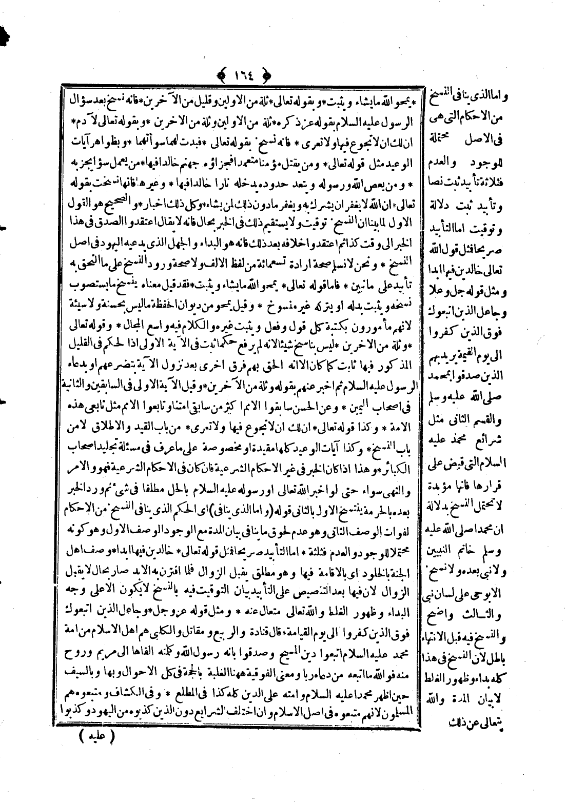 وَأَمَّا الَّذِي يُنَافِي النَّسْخَ مِنْ الْأَحْكَامِ الَّتِي هِيَ فِي الْأَصْلِ مُحْتَمِلَةٌ لِلْوُجُودِ وَالْعَدَمِ فَثَلَاثَةٌ تَأْبِيدٌ ثَبَتَ نَصًّا وَتَأْبِيدٌ ثَبَتَ دَلَالَةً وَتَوْقِيتٌ أَمَّا التَّأْبِيدُ صَرِيحًا فَمِثْلُ قَوْلِ اللَّهِ تَعَالَى {خَالِدِينَ فِيهَا أَبَدًا} [النساء: 57] وَمِثْلُ قَوْلِهِ جَلَّ وَعَلَا {وَجَاعِلُ الَّذِينَ اتَّبَعُوكَ فَوْقَ الَّذِينَ كَفَرُوا إِلَى يَوْمِ الْقِيَامَةِ} [آل عمران: 55] يُرِيدُ بِهِمْ الَّذِينَ صَدَّقُوا بِمُحَمَّدٍ - صَلَّى اللَّهُ عَلَيْهِ وَسَلَّمَ -