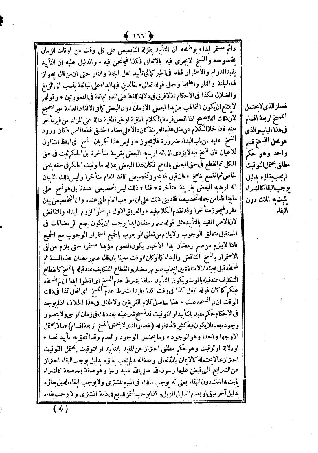 فَصَارَ الَّذِي لَا يَحْتَمِلُ النَّسْخَ أَرْبَعَةَ أَقْسَامٍ فِي هَذَا الْبَابِ وَاَلَّذِي هُوَ مَحِلُّ النَّسْخِ قِسْمٌ وَاحِدٌ وَهُوَ حُكْمٌ مُطْلَقٌ يَحْتَمِلُ التَّوْقِيتَ لَمْ يَجِبْ بَقَاؤُهُ بِدَلِيلٍ يُوجِبُ الْبَقَاءَ كَالشِّرَاءِ يَثْبُتُ بِهِ الْمِلْكُ دُونَ الْبَقَاءِ