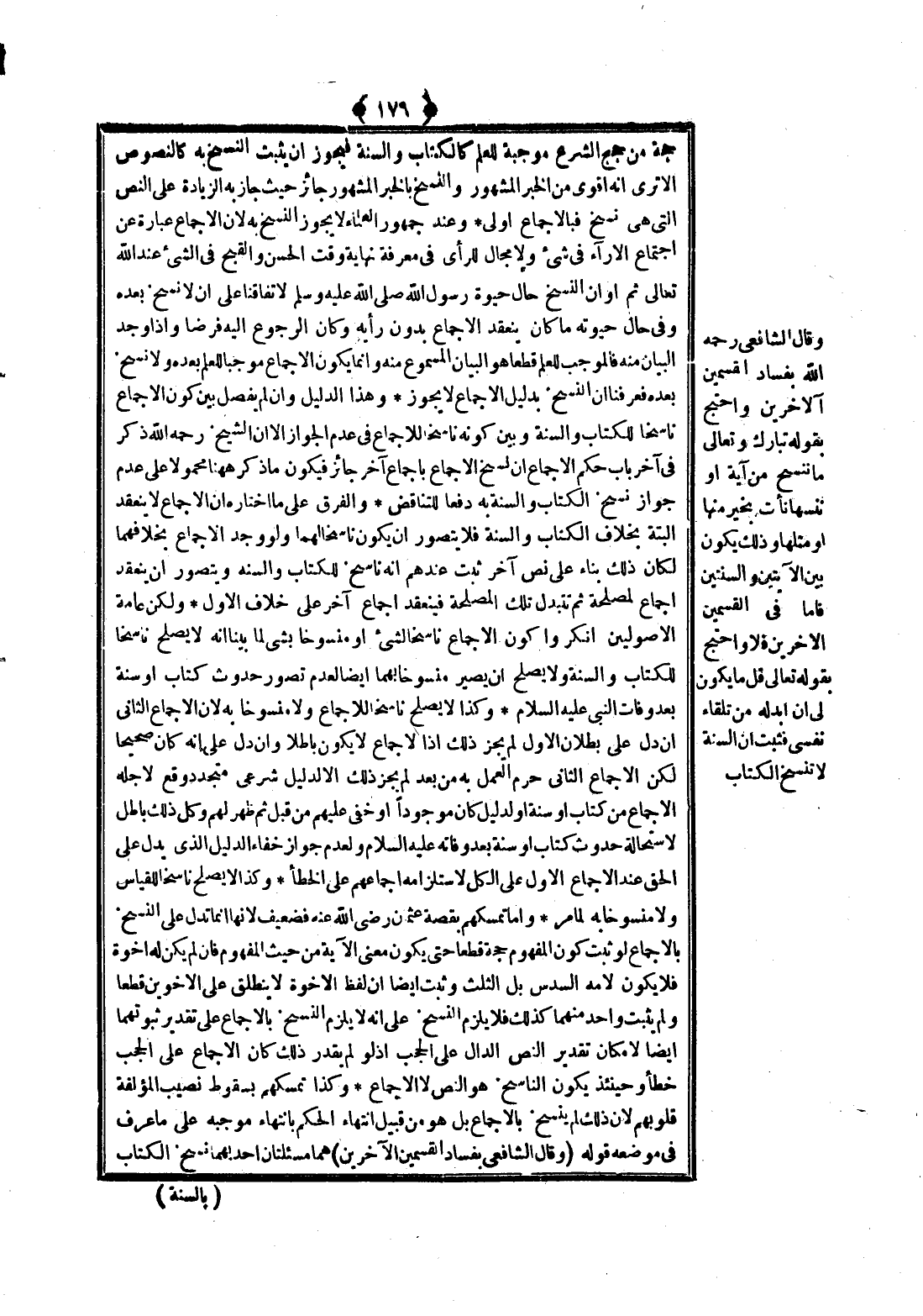 ـــــــــــــــــــــــــــــQحُجَّةٌ مِنْ حُجَجِ الشَّرْعِ مُوجِبَةٌ لِلْعِلْمِ كَالْكِتَابِ وَالسُّنَّةِ فَيَجُوزُ أَنْ يَثْبُتَ النَّسْخُ بِهِ كَالنُّصُوصِ أَلَا تَرَى أَنَّهُ أَقْوَى مِنْ الْخَبَرِ الْمَشْهُورِ وَالنَّسْخُ بِالْخَبَرِ الْمَشْهُورِ جَائِزٌ حَيْثُ جَازَ بِهِ الزِّيَادَةُ عَلَى النَّصِّ الَّتِي هِيَ نَسْخٌ فَبِالْإِجْمَاعِ أَوْلَى وَعِنْدَ جُمْهُورِ الْعُلَمَاءِ لَا يَجُوزُ النَّسْخُ بِهِ؛ لِأَنَّ الْإِجْمَاعَ عِبَارَةٌ عَنْ اجْتِمَاعِ الْآرَاءِ فِي شَيْءٍ وَلَا مَجَالَ لِلرَّأْيِ فِي مَعْرِفَةِ نِهَايَةِ وَقْتِ الْحُسْنِ وَالْقُبْحِ فِي الشَّيْءِ عِنْدَ اللَّهِ تَعَالَى ثُمَّ أَوَانِ النَّسْخِ حَالَ حَيَاةِ رَسُولِ اللَّهِ - صَلَّى اللَّهُ عَلَيْهِ وَسَلَّمَ - لِاتِّفَاقِنَا عَلَى أَنْ لَا نَسْخَ بَعْدَهُ وَفِي حَالِ حَيَاتِهِ مَا كَانَ يَنْعَقِدُ الْإِجْمَاعُ بِدُونِ رَأْيِهِ وَكَانَ الرُّجُوعُ إلَيْهِ فَرْضًا، وَإِذَا وُجِدَ الْبَيَانُ مِنْهُ فَالْمُوجِبُ لِلْعِلْمِ قَطْعًا هُوَ الْبَيَانُ الْمَسْمُوعُ مِنْهُ.