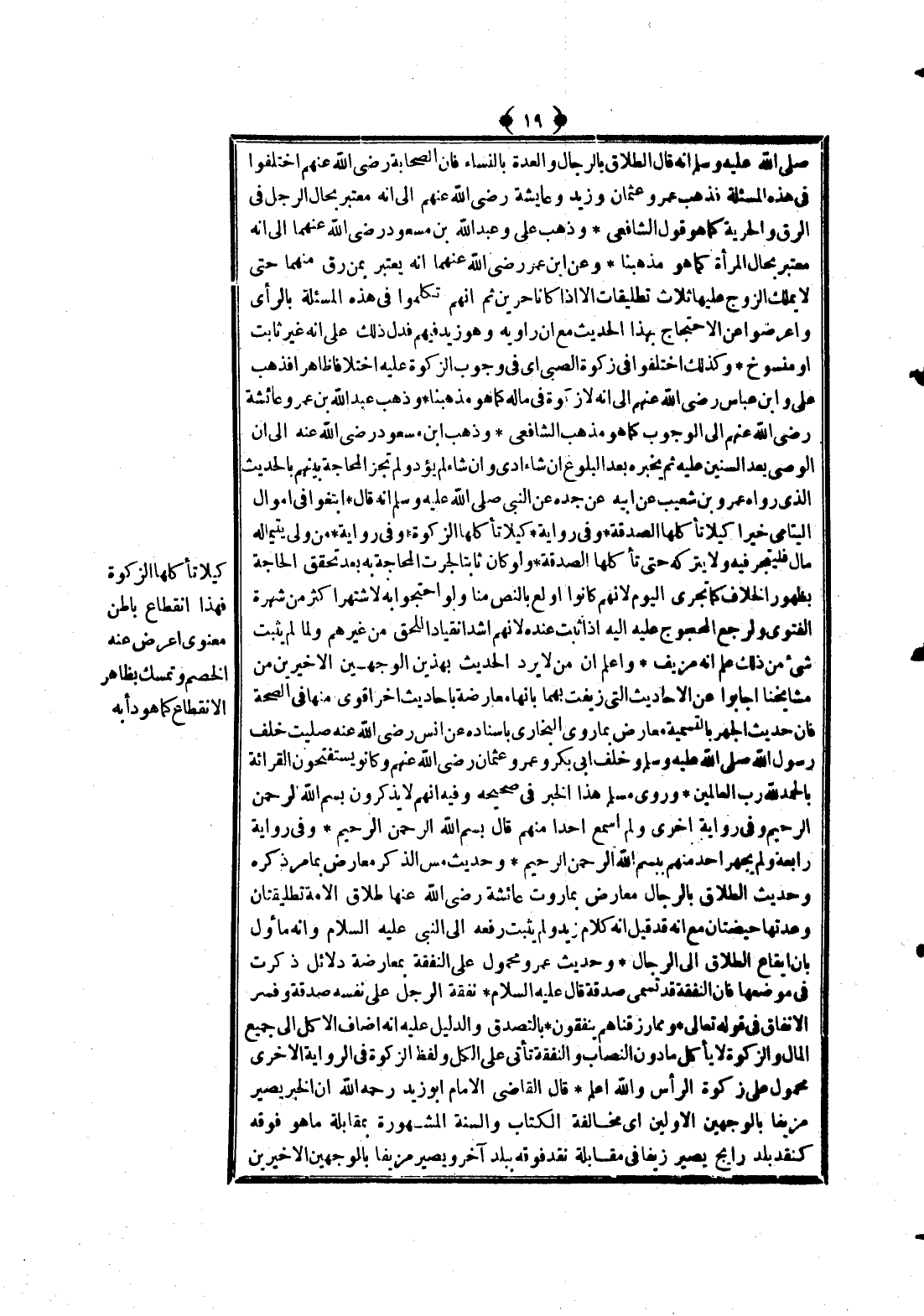 وَعَنْ ابْنِ عُمَرَ - رَضِيَ اللَّهُ عَنْهُمَا - أَنَّهُ يُعْتَبَرُ بِمَنْ رُقَّ مِنْهُمَا حَتَّى لَا يَمْلِكَ الزَّوْجُ عَلَيْهَا ثَلَاثَ تَطْلِيقَاتٍ إلَّا إذَا كَانَا حُرَّيْنِ، ثُمَّ إنَّهُمْ تَكَلَّمُوا فِي هَذِهِ الْمَسْأَلَةِ بِالرَّأْيِ وَأَعْرَضُوا عَنْ الِاحْتِجَاجِ بِهَذَا الْحَدِيثِ مَعَ أَنَّ رَاوِيَهُ وَهُوَ زَيْدٌ فِيهِمْ فَدَلَّ ذَلِكَ عَلَى أَنَّهُ غَيْرُ ثَابِتٍ أَوْ مَنْسُوخٍ وَكَذَلِكَ اخْتَلَفُوا فِي زَكَاةِ الصَّبِيِّ أَيْ فِي وُجُوبِ الزَّكَاةِ عَلَيْهِ اخْتِلَافًا ظَاهِرًا، فَذَهَبَ عَلِيٌّ وَابْنُ عَبَّاسٍ - رَضِيَ اللَّهُ عَنْهُمْ - إلَى أَنَّهُ لَا زَكَاةَ فِي مَالِهِ كَمَا هُوَ مَذْهَبُنَا وَذَهَبَ عَبْدُ اللَّهِ بْنُ عُمَرَ وَعَائِشَةُ - رَضِيَ اللَّهُ عَنْهُمْ - إلَى الْوُجُوبِ كَمَا هُوَ مَذْهَبُ الشَّافِعِيِّ وَذَهَبَ ابْنُ مَسْعُودٍ - رَضِيَ اللَّهُ عَنْهُ - إلَى أَنَّ الْوَصِيَّ يَعُدُّ السِّنِينَ عَلَيْهِ ثُمَّ يُخْبِرُهُ بَعْدَ الْبُلُوغِ إنْ شَاءَ أَدَّى وَإِنْ شَاءَ لَمْ يُؤَدِّ وَلَمْ تَجُزْ الْمُحَاجَّةُ بَيْنَهُمْ بِالْحَدِيثِ الَّذِي رَوَاهُ عَمْرُو بْنُ شُعَيْبٍ عَنْ أَبِيهِ عَنْ جَدِّهِ عَنْ النَّبِيِّ - صَلَّى اللَّهُ عَلَيْهِ وَسَلَّمَ - أَنَّهُ قَالَ «ابْتَغُوا فِي أَمْوَالِ الْيَتَامَى خَيْرًا كَيْ لَا تَأْكُلَهَا الصَّدَقَةُ» وَفِي رِوَايَةٍ كَيْ لَا تَأْكُلَهَا الزَّكَاةُ وَفِي رِوَايَةٍ «مَنْ وَلِيَ يَتِيمًا لَهُ مَالٌ فَلْيَتَّجِرْ فِيهِ وَلَا يَتْرُكْهُ حَتَّى تَأْكُلَهُ الصَّدَقَةُ» وَلَوْ كَانَ ثَابِتًا لَجَرَتْ الْمُحَاجَاةُ بِهِ بَعْدَ تَحَقُّقِ الْحَاجَةِ بِظُهُورِ الْخِلَافِ كَمَا تَجْرِي الْيَوْمَ؛ لِأَنَّهُمْ كَانُوا أَوْلَعَ بِالنَّصِّ مِنَّا وَلَوْ احْتَجُّوا بِهِ لَاشْتُهِرَ أَكْثَرَ مِنْ شُهْرَةِ الْفَتْوَى وَلَرَجَعَ الْمَحْجُوجُ عَلَيْهِ إلَيْهِ إذَا ثَبَتَ عِنْدَهُ؛ لِأَنَّهُمْ أَشَدُّ انْقِيَادًا لِلْحَقِّ مِنْ غَيْرِهِمْ وَلَمَّا لَمْ يَثْبُتْ شَيْءٌ مِنْ ذَلِكَ عُلِمَ أَنَّهُ مُزَيَّفٌ.