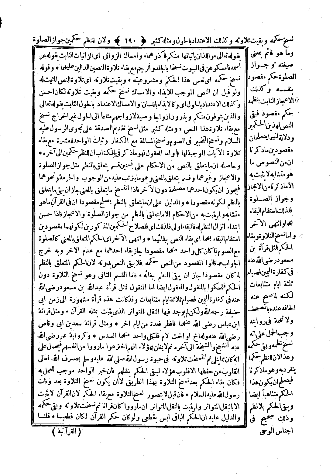 نُسِخَ حُكْمُهُ وَبَقِيَتْ تِلَاوَتُهُ، وَكَذَلِكَ الِاعْتِدَادُ بِالْحَوْلِ وَمِثْلُهُ كَثِيرٌ وَلِأَنَّ لِلنَّظْمِ حُكْمَيْنِ: جَوَازُ الصَّلَاةِ وَمَا هُوَ قَائِمٌ بِمَعْنَى صِيغَتِهِ، وَجَوَازُ الصَّلَاةِ حُكْمٌ مَقْصُودٌ بِنَفْسِهِ وَكَذَلِكَ الْإِعْجَازُ الثَّابِتُ بِنَظْمِهِ حُكْمٌ مَقْصُودٌ فَبَقِيَ النَّصُّ لِهَذَيْنِ الْحُكْمَيْنِ وَدَلَالَةُ أَنَّهُمَا يَصْلُحَانِ مَقْصُودَيْنِ مَا ذَكَرْنَا أَنَّ مِنْ النُّصُوصِ مَا هُوَ مُتَشَابِهٌ لَا يَثْبُتُ بِهِ إلَّا مَا ذَكَرْنَا مِنْ الْإِعْجَازِ وَجَوَازِ الصَّلَاةِ فَلِذَلِكَ اسْتَقَامَ الْبَقَاءُ بِهِمَا وَانْتَهَى الْآخَرُ.