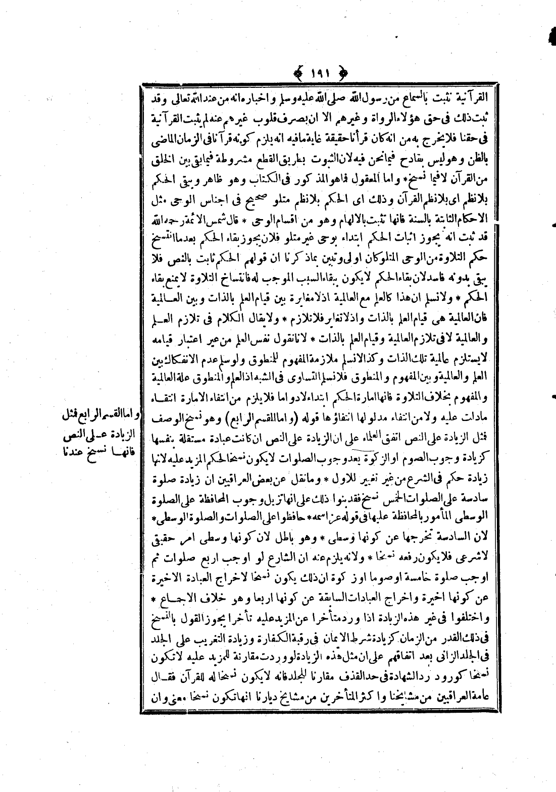 وَأَمَّا الْقِسْمُ الرَّابِعُ فَمِثْلُ الزِّيَادَةِ عَلَى النَّصِّ فَإِنَّهَا نَسْخٌ عِنْدَنَا