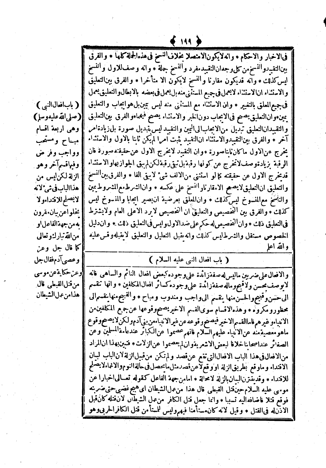 - عَلَيْهِ السَّلَامُ -) وَالْأَفْعَالُ عَلَى ضَرْبَيْنِ مَا لَيْسَ لَهُ صِفَةٌ زَائِدَةٌ عَلَى وُجُودِهِ كَبَعْضِ أَفْعَالِ النَّائِمِ وَالسَّاهِي، فَإِنَّهُ لَا يُوصَفُ بِحُسْنٍ وَلَا قُبْحٍ، وَمَالَهُ صِفَةٌ زَائِدَةٌ عَلَى وُجُودِهِ كَسَائِرِ أَفْعَالِ الْمُكَلَّفِينَ وَإِنَّهَا تَنْقَسِمُ إلَى حَسَنٍ وَقَبِيحٍ وَالْحَسَنُ مِنْهَا يَنْقَسِمُ إلَى وَاجِبٍ وَمَنْدُوبٍ وَمُبَاحٍ وَالْقَبِيحُ مِنْهَا يَنْقَسِمُ إلَى مَحْظُورٍ وَمَكْرُوهٍ وَهَذِهِ الْأَقْسَامُ سِوَى الْقِسْمِ الْأَخِيرِ يَصِحُّ وُقُوعُهَا عَنْ جَمِيعِ الْمُكَلَّفِينَ مِنْ الْأَنْبِيَاءِ وَغَيْرِهِمْ فَأَمَّا الْقِسْمُ الْأَخِيرُ فَيَصِحُّ وُقُوعُهُ عَنْ غَيْرِ الْأَنْبِيَاءِ مِنْ بَنِي آدَمَ وَلَكِنْ لَا يَصِحُّ وُقُوعُ مَا هُوَ مَعْصِيَةٌ مِنْهُ عَنْ الْأَنْبِيَاءِ - عَلَيْهِمْ السَّلَامُ -، فَإِنَّهُمْ عُصِمُوا عَنْ الْكَبَائِرِ عِنْدَ عَامَّةِ الْمُسْلِمِينَ وَعَنْ الصَّغَائِرِ عِنْدَ أَصْحَابِنَا خِلَافًا لِبَعْضِ الْأَشْعَرِيَّةِ وَإِنْ لَمْ يُعْصَمُوا عَنْ الزَّلَّاتِ فَتَبَيَّنَ بِهَذَا أَنَّ الْمُرَادَ مِنْ الْأَفْعَالِ فِي هَذَا الْبَابِ الْأَفْعَالُ الَّتِي تَقَعُ عَنْ قَصْدٍ وَلَمْ تَكُنْ مِنْ قَبِيلِ الزَّلَّةِ؛ لِأَنَّ الْبَابَ لِبَيَانِ الِاقْتِدَاءِ وَمَا وَقَعَ بِطَرِيقِ الزَّلَّةِ أَوْ وَقَعَ لَا عَنْ قَصْدٍ مِثْلُ مَا يَحْصُلُ فِي حَالَةِ النَّوْمِ وَالْإِغْمَاءِ لَا يَصْلُحُ لِلِاقْتِدَاءِ.