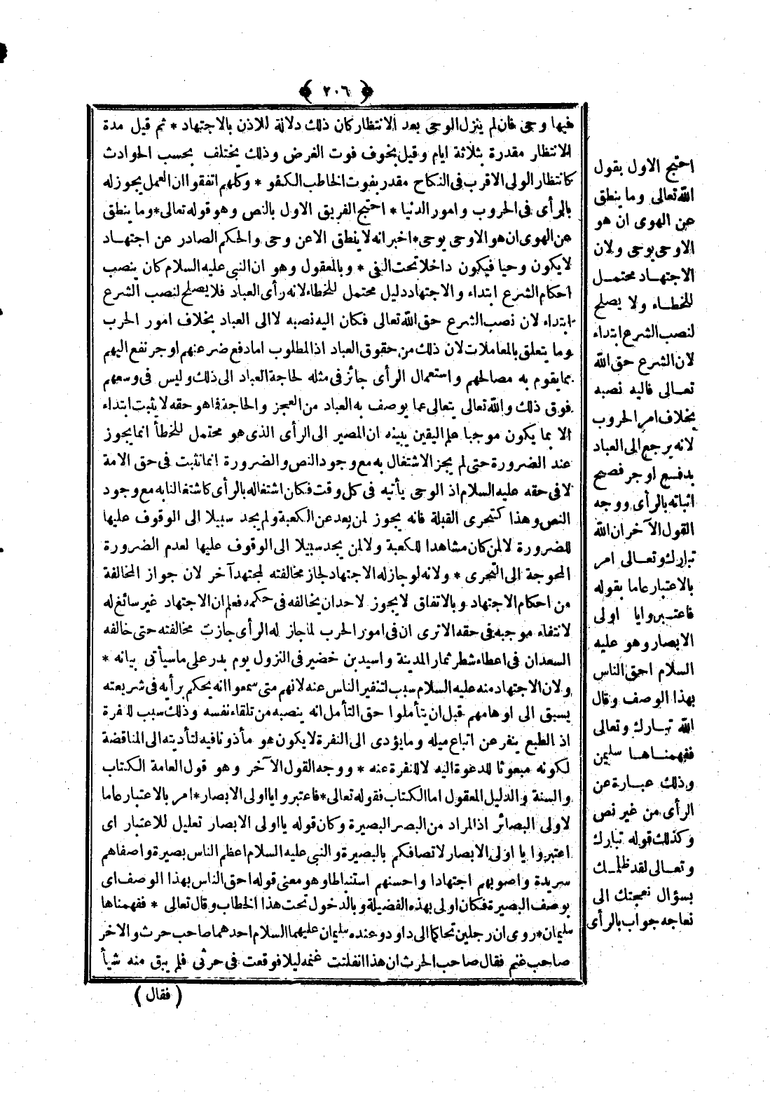 ـــــــــــــــــــــــــــــQفِيهَا وَحْيٌ، فَإِنْ لَمْ يَنْزِلْ الْوَحْيُ بَعْدَ الِانْتِظَارِ كَانَ ذَلِكَ دَلَالَةً لِلْإِذْنِ بِالِاجْتِهَادِ ثُمَّ قِيلَ: مُدَّةُ الِانْتِظَارِ مُقَدَّرَةٌ بِثَلَاثَةِ أَيَّامٍ وَقِيلَ بِخَوْفِ فَوْتِ الْغَرَضِ وَذَلِكَ يَخْتَلِفُ بِحَسَبِ الْحَوَادِثِ كَانْتِظَارِ الْوَلِيِّ الْأَقْرَبِ فِي النِّكَاحِ مُقَدَّرٌ بِفَوْتِ الْخَاطِبِ الْكُفْءِ.