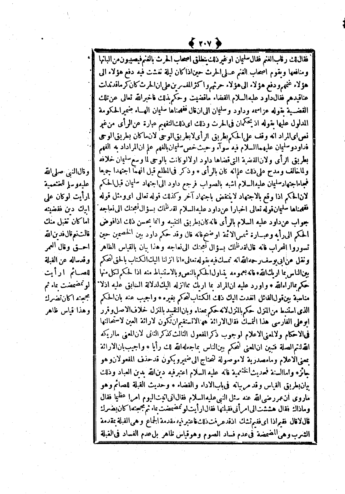 ـــــــــــــــــــــــــــــQفَقَالَ لَك رِقَابُ الْغَنَمِ فَقَالَ سُلَيْمَانُ أَوَ غَيْرَ ذَلِكَ يَنْطَلِقُ أَصْحَابُ الْحَرْثِ بِالْغَنَمِ فَيُصِيبُونَ مِنْ أَلْبَانِهَا وَمَنَافِعِهَا وَيَقُومُ أَصْحَابُ الْغَنَمِ عَلَى الْحَرْثِ حَتَّى إذَا كَانَ لَيْلَةٌ نَفَشَتْ فِيهِ دَفَعَ هَؤُلَاءِ إلَى هَؤُلَاءِ غَنَمَهُمْ وَدَفَعَ هَؤُلَاءِ إلَى هَؤُلَاءِ حَرْثَهُمْ وَأَكْثَرُ الْمُفَسِّرِينَ عَلَى أَنَّ الْحَرْثَ كَانَ كَرْمًا قَدْ تَدَلَّتْ عَنَاقِيدُهُمْ فَقَالَ دَاوُد - عَلَيْهِ السَّلَامُ - الْقَضَاءُ مَا قَضَيْت وَحَكَمَ بِذَلِكَ فَأَخْبَرَ اللَّهُ تَعَالَى عَنْ تِلْكَ الْقَضِيَّةِ بِقَوْلِهِ عَزَّ اسْمُهُ {وَدَاوُدَ وَسُلَيْمَانَ} [الأنبياء: 78] إلَى أَنْ قَالَ {فَفَهَّمْنَاهَا سُلَيْمَانَ} [الأنبياء: 79] الْهَاءُ ضَمِيرُ الْحُكُومَةِ الْمَدْلُولُ عَلَيْهَا بِقَوْلِهِ إذْ يَحْكُمَانِ فِي الْحَرْثِ وَذَلِكَ أَيْ ذَلِكَ التَّفْهِيمُ عِبَارَةٌ عَنْ الرَّأْيِ مِنْ غَيْرِ نَصٍّ أَيْ الْمُرَادُ أَنَّهُ وَقَفَ عَلَى الْحُكْمِ بِطَرِيقِ الرَّأْيِ لَا بِطَرِيقِ الْوَحْيِ؛ لِأَنَّ مَا كَانَ بِطَرِيقِ الْوَحْيِ فَدَاوُد وَسُلَيْمَانُ - عَلَيْهِمَا السَّلَامُ - فِيهِ سَوَاءٌ وَحَيْثُ خَصَّ سُلَيْمَانَ بِالْفَهْمِ عُلِمَ أَنَّ الْمُرَادَ بِهِ الْفَهْمُ بِطَرِيقِ الرَّأْيِ وَلِأَنَّ الْقَضِيَّةَ الَّتِي قَضَاهَا دَاوُد أَوَّلًا لَوْ كَانَتْ بِالْوَحْيِ لَمَا وَسِعَ سُلَيْمَانَ خِلَافُهُ وَلَمَّا خَالَفَ وَمُدِحَ عَلَى ذَلِكَ عُلِمَ أَنَّهُ كَانَ بِالرَّأْيِ.
