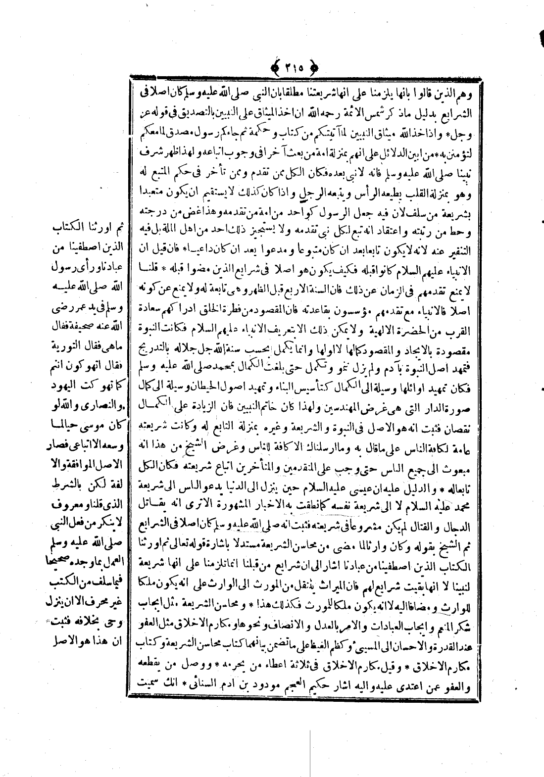 {ثُمَّ أَوْرَثْنَا الْكِتَابَ الَّذِينَ اصْطَفَيْنَا مِنْ عِبَادِنَا} [فاطر: 32] «وَرَأَى رَسُولُ اللَّهِ - صَلَّى اللَّهُ عَلَيْهِ وَسَلَّمَ - فِي يَدِ عُمَرَ - رَضِيَ اللَّهُ عَنْهُ - صَحِيفَةً فَقَالَ مَا هِيَ فَقَالَ التَّوْرَاةُ فَقَالَ أَتُهَوِّكُونَ أَنْتُمْ كَمَا تَهَوَّكَتْ الْيَهُودُ وَالنَّصَارَى وَاَللَّهِ لَوْ كَانَ مُوسَى حَيًّا لَمَا وَسِعَهُ إلَّا اتِّبَاعِي» فَصَارَ الْأَصْلُ الْمُوَافَقَةَ وَالْأُلْفَة لَكِنْ بِالشَّرْطِ الَّذِي قُلْنَا وَمَعْرُوفٌ لَا يُنْكَرُ مِنْ فِعْلِ النَّبِيِّ - صَلَّى اللَّهُ عَلَيْهِ وَسَلَّمَ - الْعَمَلُ بِمَا وَجَدَهُ صَحِيحًا فِيمَا سَلَفَ مِنْ الْكُتُبِ غَيْرَ مُحَرَّفٍ إلَّا أَنْ يَنْزِلَ وَحْيٌ بِخِلَافِهِ فَثَبَتَ أَنَّ هَذَا هُوَ الْأَصْلُ