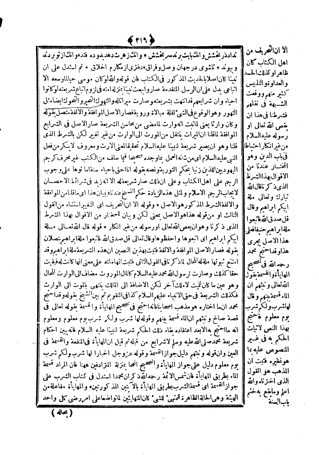 ـــــــــــــــــــــــــــــQنِدَاد ذَرْ بخشش، وَإِنَّك بايت بِرَنْدِ سِرّ بخشش، وَإِنَّك زَهِرَتْ دهد بِدُودِهِ فَتِدْ، وَإِنَّك أزتوبر دند وبيوند تاشوي درجهان وَصَلِّ وَفِرَاق دفترى أَزّ مَكَارِم أَخْلَاق ثُمَّ اسْتَدَلَّ عَلَى أَنَّ نَبِيَّنَا كَانَ أَصْلًا بِالْحَدِيثِ الْمَذْكُورِ فِي الْكِتَابِ، فَإِنَّ قَوْلَهُ: «وَاَللَّهِ لَوْ كَانَ مُوسَى حَيًّا لَمَا وَسِعَهُ إلَّا اتِّبَاعِي» يَدُلُّ عَلَى أَنَّ الرُّسُلَ الْمُتَقَدِّمَةَ صَارُوا بِبَعْثِ نَبِيِّنَا بِمَنْزِلَةِ أُمَّتِهِ فِي لُزُومِ اتِّبَاعِ شَرِيعَتِهِ لَوْ كَانُوا أَحْيَاءً وَأَنَّ شَرَائِعَهُمْ قَدْ انْتَهَتْ بِشَرِيعَتِهِ وَصَارَتْ مِيرَاثًا لَهُ وَالتَّهَوُّكُ التَّحَيُّرُ وَالتَّحَوُّكُ أَيْضًا مِثْلُ التَّهَوُّرِ وَهُوَ الْوُقُوعُ فِي الشَّيْءِ لِقِلَّةِ مُبَالَاةٍ وَرَوِيَّةٍ فَصَارَ الْأَصْلُ الْمُوَافَقَةَ وَالْأُلْفَةَ مُتَّصِلٌ بِقَوْلِهِ وَكَانَ وَارِثًا يَعْنِي لَمَّا ثَبَتَ أَنَّهُ وَارِثٌ لِمَا مَضَى مِنْ مَحَاسِنِ الشَّرِيعَةِ صَارَ الْأَصْلُ فِي الشَّرَائِعِ الْمُوَافَقَةَ لِمَا قُلْنَا إنَّ الْمِيرَاثَ يَنْتَقِلُ مِنْ الْمُوَرِّثِ إلَى الْوَارِثِ مِنْ غَيْرِ تَغْيِيرٍ لَكِنْ بِالشَّرْطِ الَّذِي قُلْنَا وَهُوَ أَنْ يَصِيرَ شَرِيعَةً لِنَبِيِّنَا - عَلَيْهِ السَّلَامُ - تَحْقِيقًا لِمَعْنَى الْإِرْثِ وَمَعْرُوفٌ لَا يُنْكَرُ مِنْ فِعْلِ النَّبِيِّ - عَلَيْهِ السَّلَامُ - أَيْ مِنْ شَأْنِهِ الْعَمَلُ بِمَا وَجَدَهُ صَحِيحًا فِيمَا سَلَفَ مِنْ الْكُتُبِ غَيْرَ مُحَرَّفٍ كَرَجْمِ الْيَهُودِيَّيْنِ اللَّذَيْنِ زَنَيَا بِحُكْمِ التَّوْرَاةِ وَنَصَّهُ بِقَوْلِهِ أَنَا أَحَقُّ بِإِحْيَاءِ سُنَّةٍ أَمَاتُوهَا عَلَى وُجُوبِ الرَّجْمِ عَلَى أَهْلِ الْكِتَابِ وَعَلَى أَنَّ ذَلِكَ صَارَ شَرِيعَةً لَهُ إلَّا أَنَّهُ زِيدَ فِي شَرَائِطِ الْإِحْصَانِ لِإِيجَابِ الرَّجْمِ الْإِسْلَامُ وَلِمِثْلِ هَذِهِ الزِّيَادَةِ حُكْمُ النَّسْخِ عِنْدَنَا فَبِبَيَانِ هَذَا أَيْ مَا قُلْنَا مِنْ الْمُوَافَقَةِ وَالْأُلْفَةِ الشَّرْطُ الْمَذْكُورُ هُوَ الْأَصْلُ.