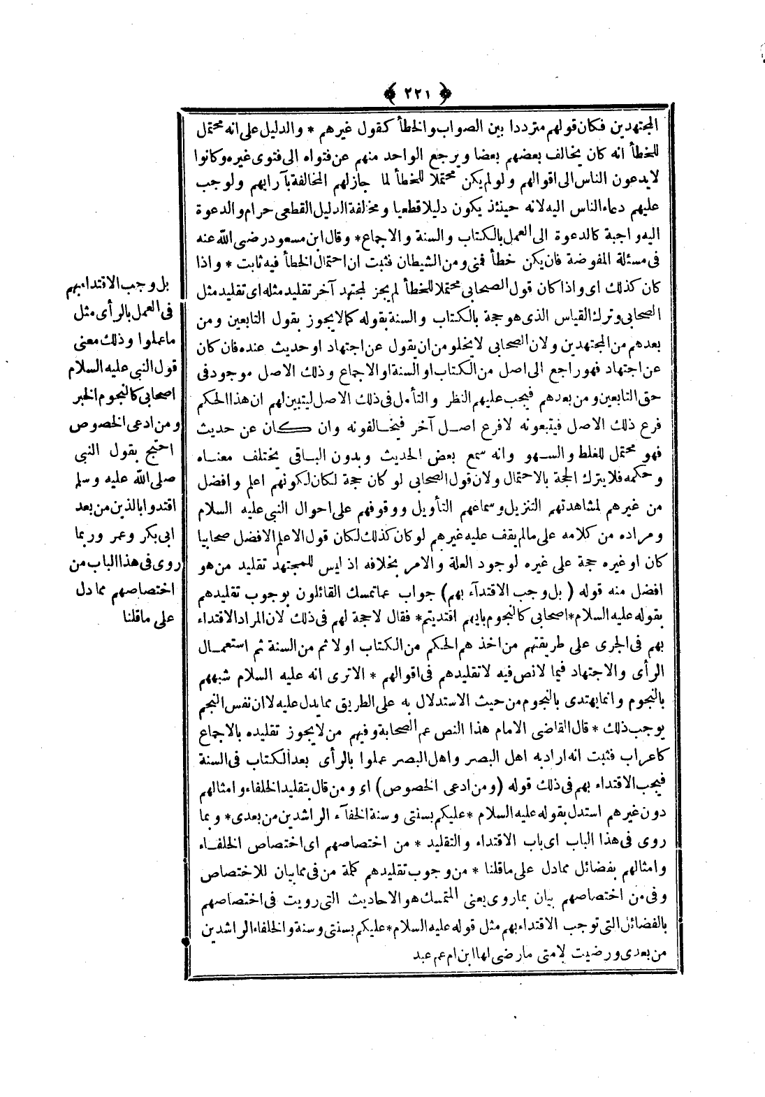 بَلْ وَجَبَ الِاقْتِدَاءُ بِهِمْ فِي الْعَمَلِ بِالرَّأْيِ مِثْلَ مَا عَمِلُوا، وَذَلِكَ مَعْنَى قَوْلِ النَّبِيِّ - عَلَيْهِ السَّلَامُ - «أَصْحَابِي كَالنُّجُومِ» الْخَبَرَ.