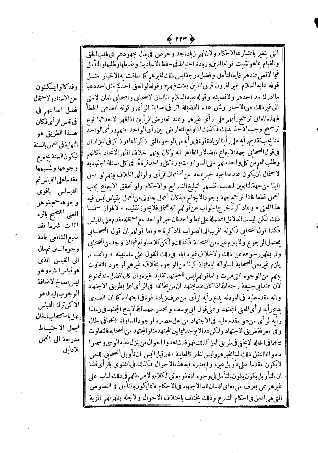وَقَدْ كَانُوا يَسْكُتُونَ عَنْ الْإِسْنَادِ وَلِاحْتِمَالِ فَضْلِ إصَابَتِهِمْ فِي نَفْسِ الرَّأْيِ فَكَانَ هَذَا الطَّرِيقُ هُوَ النِّهَايَةَ فِي الْعَمَلِ بِالسُّنَّةِ لِيَكُونَ السُّنَّةُ بِجَمِيعِ وُجُوهِهَا وَشِبْهِهَا مُقَدَّمًا عَلَى الْقِيَاسِ ثُمَّ الْقِيَاسُ بِأَقْوَى وُجُوهِهِ حُجَّةً وَهُوَ الْمَعْنَى الصَّحِيحُ بِأَثَرِهِ الثَّابِتِ شَرْعًا فَقَدْ ضَيَّعَ الشَّافِعِيُّ عَامَّةً وُجُوهَ السُّنَنِ ثُمَّ مَالَ إلَى الْقِيَاسِ الَّذِي هُوَ قِيَاسُ الشَّبَهَ وَهُوَ لَيْسَ بِصَالِحٍ لِإِضَافَةِ الْوُجُوبِ إلَيْهِ فَمَا هُوَ إلَّا كَمَنْ تَرَكَ الْقِيَاسَ وَعَمِلَ بِاسْتِصْحَابِ الْحَالِ فَجَعَلَ الِاحْتِيَاطَ مَدْرَجَةً إلَى الْعَمَلِ بِلَا دَلِيلٍ