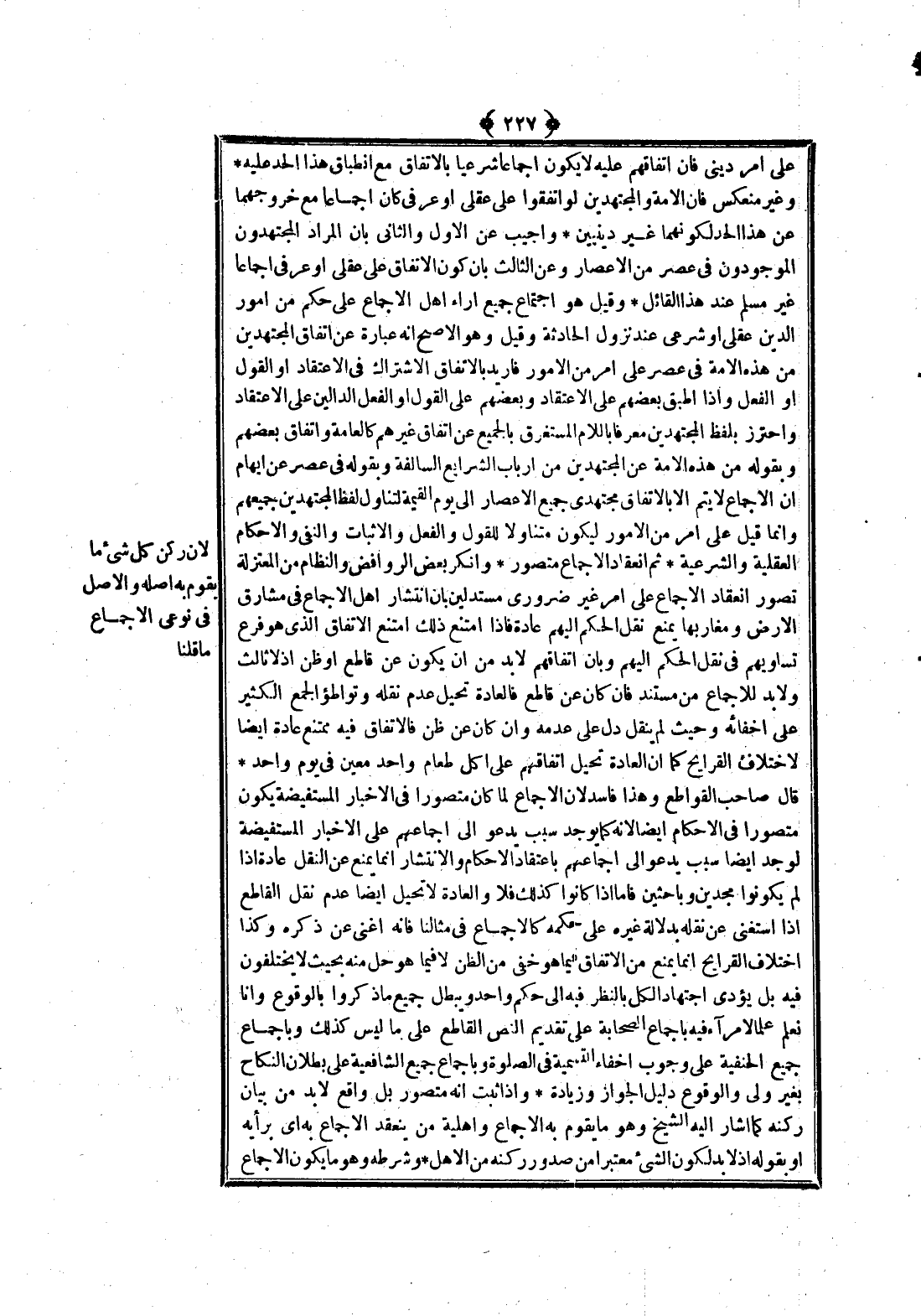 ـــــــــــــــــــــــــــــQعَلَى أَمْرٍ دِينِيٍّ، فَإِنَّ اتِّفَاقَهُمْ عَلَيْهِ لَا يَكُونُ إجْمَاعًا شَرْعِيًّا بِالِاتِّفَاقِ مَعَ انْطِبَاقِ هَذَا الْحَدِّ عَلَيْهِ وَغَيْرَ مُنْعَكِسٍ، فَإِنَّ الْأُمَّةَ وَالْمُجْتَهِدِينَ لَوْ اتَّفَقُوا عَلَى عَقْلِيٍّ أَوْ عُرْفِيٍّ كَانَ إجْمَاعًا مَعَ خُرُوجِهِمَا عَنْ هَذَا الْحَدِّ لِكَوْنِهِمَا غَيْرَ دِينِيَّيْنِ وَأُجِيبَ عَنْ الْأَوَّلِ وَالثَّانِي بِأَنَّ الْمُرَادَ الْمُجْتَهِدُونَ الْمَوْجُودُونَ فِي عَصْرٍ مِنْ الْأَعْصَارِ وَعَنْ الثَّالِثِ بِأَنَّ كَوْنَ الِاتِّفَاقِ عَلَى عَقْلِيٍّ أَوْ عُرْفِيٍّ إجْمَاعًا غَيْرُ مُسَلَّمٍ عِنْدَ هَذَا الْقَائِلِ وَقِيلَ هُوَ اجْتِمَاعُ جَمِيعِ آرَاءِ أَهْلِ الْإِجْمَاعِ عَلَى حُكْمٍ مِنْ أُمُورِ الدِّينِ عَقْلِيٍّ أَوْ شَرْعِيٍّ عِنْدَ نُزُولِ الْحَادِثَةِ.