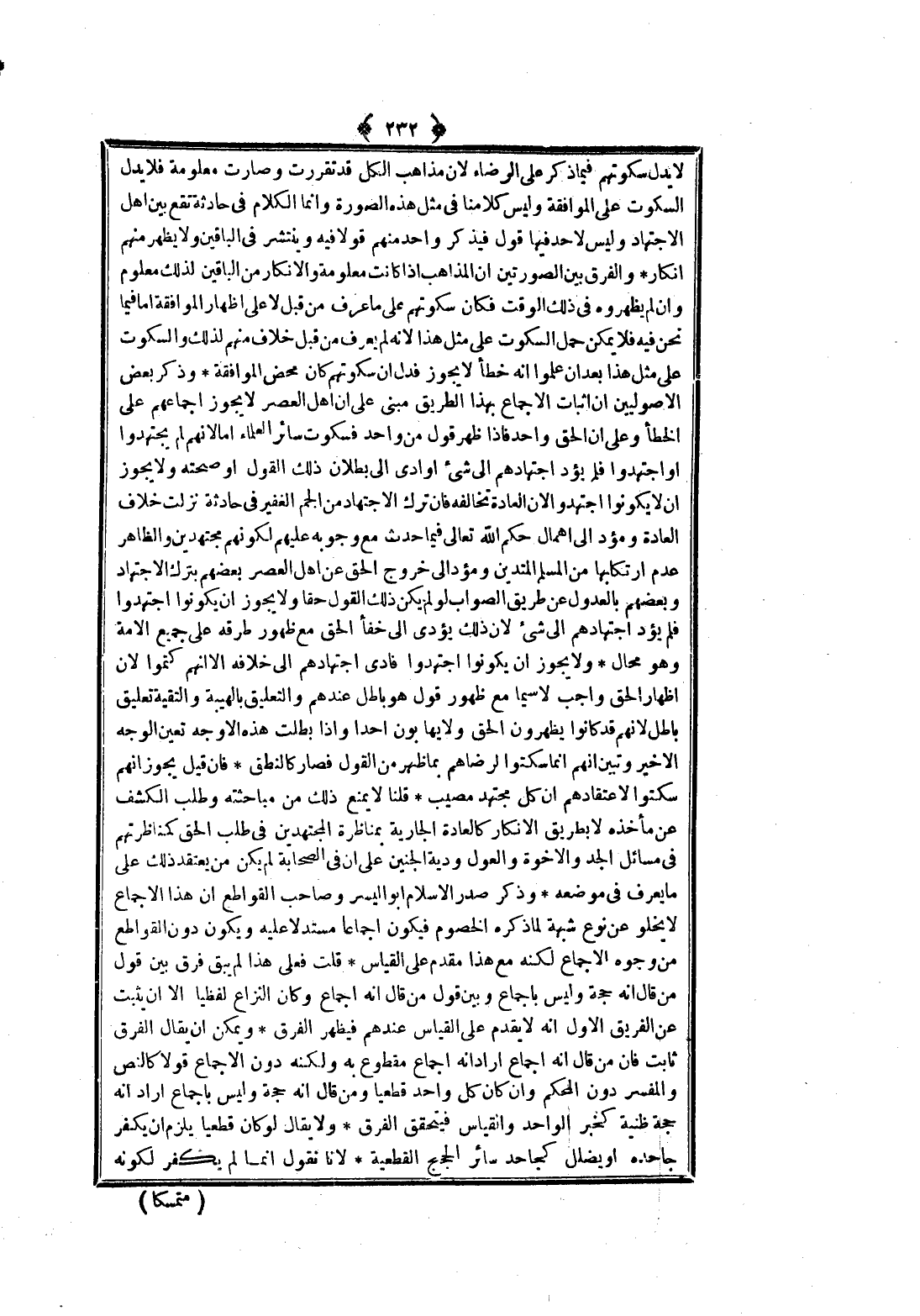 ـــــــــــــــــــــــــــــQلَا يَدُلُّ سُكُوتُهُمْ فِيمَا ذُكِرَ عَلَى الرِّضَاءِ؛ لِأَنَّ مَذَاهِبَ الْكُلِّ قَدْ تَقَرَّرَتْ وَصَارَتْ مَعْلُومَةً فَلَا يَدُلُّ السُّكُوتُ عَلَى الْمُوَافَقَةِ وَلَيْسَ كَلَامُنَا فِي مِثْلِ هَذِهِ الصُّورَةِ، وَإِنَّمَا الْكَلَامُ فِي حَادِثَةٍ تَقَعُ بَيْنَ أَهْلِ الِاجْتِهَادِ وَلَيْسَ لِأَحَدٍ فِيهَا قَوْلٌ فَيَذْكُرُ وَاحِدٌ مِنْهُمْ قَوْلًا فِيهِ وَيَنْتَشِرُ فِي الْبَاقِينَ وَلَا يَظْهَرُ مِنْهُمْ إنْكَارٌ وَالْفَرْقُ بَيْنَ الصُّورَتَيْنِ أَنَّ الْمَذَاهِبَ إذَا كَانَتْ مَعْلُومَةً وَالْإِنْكَارُ مِنْ الْبَاقِينَ لِذَلِكَ مَعْلُومٌ، وَإِنْ لَمْ يُظْهِرُوهُ فِي ذَلِكَ الْوَقْتِ فَكَانَ سُكُوتُهُمْ عَلَى مَا عُرِفَ مِنْ قَبْلُ لَا عَلَى إظْهَارِ الْمُوَافَقَةِ أَمَّا فِيمَا نَحْنُ فِيهِ فَلَا يُمْكِنُ حَمْلُ السُّكُوتِ عَلَى مِثْلِ هَذَا؛ لِأَنَّهُ لَمْ يُعْرَفْ مِنْ قَبْلُ خِلَافٌ مِنْهُمْ لِذَلِكَ وَالسُّكُوتُ عَلَى مِثْلِ هَذَا بَعْدَ أَنْ عَلِمُوا أَنَّهُ خَطَأٌ لَا يَجُوزُ فَدَلَّ أَنَّ سُكُوتَهُمْ كَانَ مَحْضَ الْمُوَافَقَةِ.