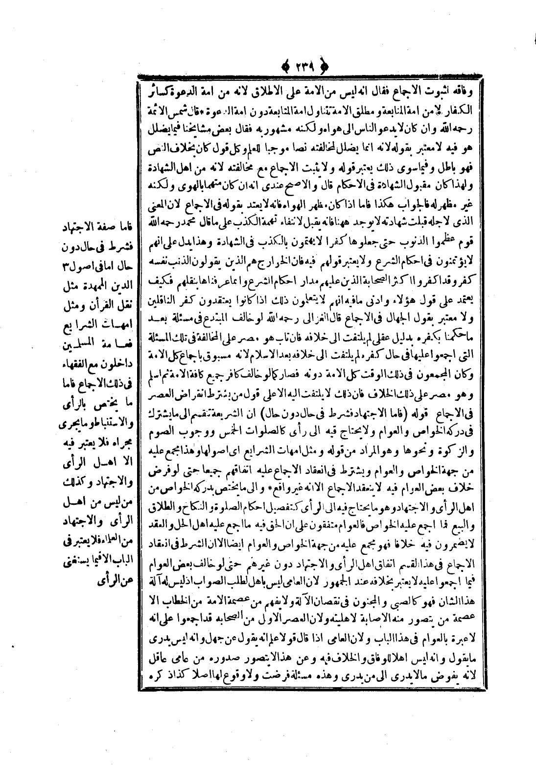 فَأَمَّا صِفَةُ الِاجْتِهَادِ فَشَرْطٌ فِي حَالٍ دُونَ حَالٍ أَمَّا فِي أُصُولِ الدِّينِ الْمُمَهَّدَةِ مِثْلُ نَقْلِ الْقُرْآنِ، وَمِثْلُ أُمَّهَاتِ الشَّرَائِعِ فَعَامَّةُ الْمُسْلِمِينَ دَاخِلُونَ مَعَ الْفُقَهَاءِ فِي ذَلِكَ الْإِجْمَاعِ فَأَمَّا مَا يَخْتَصُّ بِالرَّأْيِ وَالِاسْتِنْبَاطِ وَمَا يَجْرِي مَجْرَاهُ فَلَا يُعْتَبَرُ فِيهِ إلَّا أَهْلُ الرَّأْيِ وَالِاجْتِهَادِ وَكَذَلِكَ مَنْ لَيْسَ مِنْ أَهْلِ الرَّأْيِ وَالِاجْتِهَادِ مِنْ الْعُلَمَاءِ فَلَا يُعْتَبَرُ فِي الْبَابِ إلَّا فِيمَا يُسْتَغْنَى عَنْ الرَّأْيِ