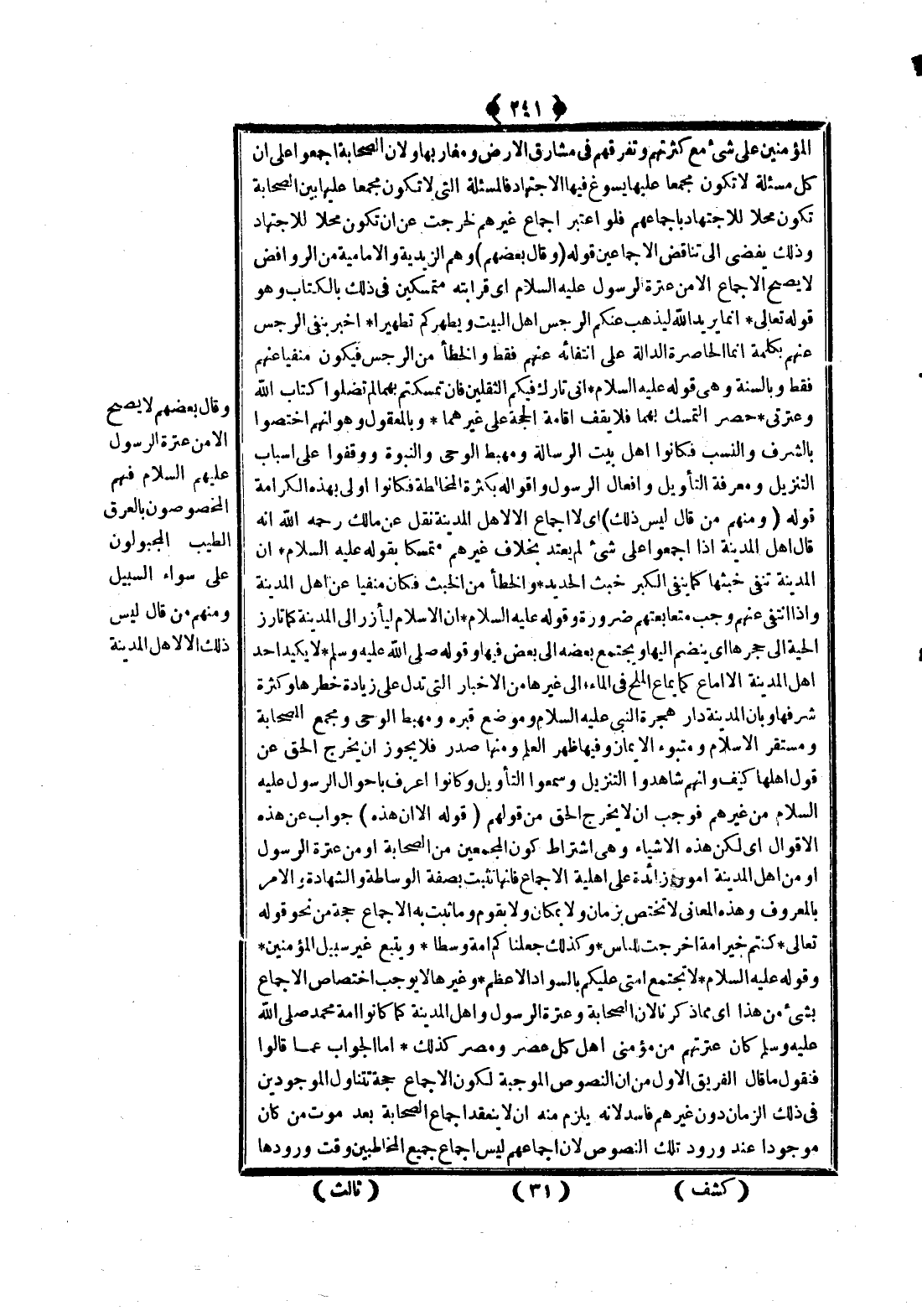 قَوْلُهُ: (وَقَالَ بَعْضُهُمْ) وَهُمْ الزَّيْدِيَّةُ وَالْإِمَامِيَّةُ مِنْ الرَّوَافِضِ: لَا يَصِحُّ الْإِجْمَاعُ إلَّا مِنْ عِتْرَةِ الرَّسُولِ - عَلَيْهِ السَّلَامُ - أَيْ قَرَابَتِهِ مُتَمَسِّكِينَ فِي ذَلِكَ بِالْكِتَابِ وَهُوَ قَوْله تَعَالَى {إِنَّمَا يُرِيدُ اللَّهُ لِيُذْهِبَ عَنْكُمُ الرِّجْسَ أَهْلَ الْبَيْتِ وَيُطَهِّرَكُمْ تَطْهِيرًا} [الأحزاب: 33] أَخْبَرَ بِنَفْيِ الرِّجْسِ عَنْهُمْ بِكَلِمَةِ إنَّمَا الْحَاصِرَةِ الدَّالَّةِ عَلَى انْتِفَائِهِ عَنْهُمْ فَقَطْ، وَالْخَطَأُ مِنْ الرِّجْسِ فَيَكُونُ مَنْفِيًّا عَنْهُمْ فَقَطْ، وَبِالسُّنَّةِ، وَهِيَ قَوْلُهُ - عَلَيْهِ السَّلَامُ - «إنِّي تَارِكٌ فِيكُمْ الثَّقَلَيْنِ فَإِنْ تَمَسَّكْتُمْ بِهِمَا لَمْ تَضِلُّوا كِتَابَ اللَّهِ وَعِتْرَتِي» حَصَرَ التَّمَسُّكَ بِهِمَا فَلَا يَقِفُ إقَامَةُ الْحُجَّةِ عَلَى غَيْرِهِمَا وَبِالْمَعْقُولِ وَهُوَ أَنَّهُمْ اخْتَصُّوا بِالشَّرَفِ وَالنَّسَبِ فَكَانُوا أَهْلَ بَيْتِ الرِّسَالَةِ وَمَهْبِطَ الْوَحْيِ وَالنُّبُوَّةِ وَوَقَفُوا عَلَى أَسْبَابِ التَّنْزِيلِ وَمَعْرِفَةِ التَّأْوِيلِ وَأَفْعَالِ الرَّسُولِ وَأَقْوَالِهِ بِكَثْرَةِ الْمُخَالَطَةِ فَكَانُوا أَوْلَى بِهَذِهِ الْكَرَامَةِ.