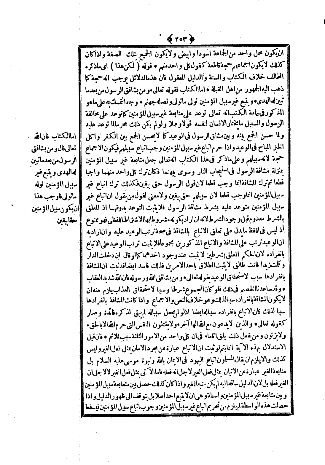 ثُمَّ تَرْكُ الْمُشَاقَّةِ إنَّمَا وَجَبَ قَطْعًا؛ لِأَنَّ قَوْلَ الرَّسُولِ حَقٌّ بِيَقِينٍ فَكَذَلِكَ تَرْكُ اتِّبَاعِ غَيْرِ سَبِيلِ الْمُؤْمِنِينَ إنَّمَا وَجَبَ قَطْعًا؛ لِأَنَّ سَبِيلَهُمْ حَقٌّ بِيَقِينٍ وَلَا مَعْنَى لِقَوْلِ مَنْ يَقُولُ: إنَّ اتِّبَاعَ غَيْرِ سَبِيلِ الْمُؤْمِنِينَ مُتَوَعَّدٌ عَلَيْهِ بِشَرْطِ مُشَاقَّةِ الرَّسُولِ فَلَا يَثْبُتُ التَّوَعُّدُ بِدُونِهَا إذْ الْمُعَلَّقُ بِالشَّرْطِ مَعْدُومٌ قَبْلَ وُجُودِ الشَّرْطِ؛ لِأَنَّهُ إنْ أَرَادَ بِكَوْنِهِ مَشْرُوطًا بِهَا الِاشْتِرَاطَ اللَّفْظِيَّ فَهُوَ مَمْنُوعٌ إذْ لَيْسَ فِي اللَّفْظِ مَا يَدُلُّ عَلَى تَعَلُّقِ الِاتِّبَاعِ بِالْمُشَاقَّةِ فِي صِحَّةِ تَرَتُّبِ الْوَعِيدِ عَلَيْهِ، وَإِنْ أَرَادَ بِهِ أَنَّ الْوَعِيدَ تَرَتَّبَ عَلَى الْمُشَاقَّةِ وَالِاتِّبَاعِ الْمَذْكُورَيْنِ مَجْمُوعًا فَلَا يَثْبُتُ تَرَتُّبُ الْوَعِيدِ عَلَى الِاتِّبَاعِ بِانْفِرَادِهِ؛ لِأَنَّ الْحُكْمَ الْمُعَلَّقَ بِشَرْطَيْنِ لَا يَثْبُتُ عِنْدَ وُجُودِ أَحَدِهِمَا كَمَا لَوْ قَالَ إنْ دَخَلْت الدَّارَ وَكَلَّمْت زَيْدًا فَأَنْتِ طَالِقٌ لَا يَثْبُتُ الطَّلَاقُ بِأَحَدِ الْأَمْرَيْنِ فَذَلِكَ فَاسِدٌ أَيْضًا قَدْ ثَبَتَ أَنَّ الْمُشَاقَّةَ بِانْفِرَادِهَا سَبَبٌ لِاسْتِحْقَاقِ الْوَعِيدِ بِقَوْلِهِ تَعَالَى {وَمَنْ يُشَاقِقِ اللَّهَ وَرَسُولَهُ فَإِنَّ اللَّهَ شَدِيدُ الْعِقَابِ} [الأنفال: 13] .