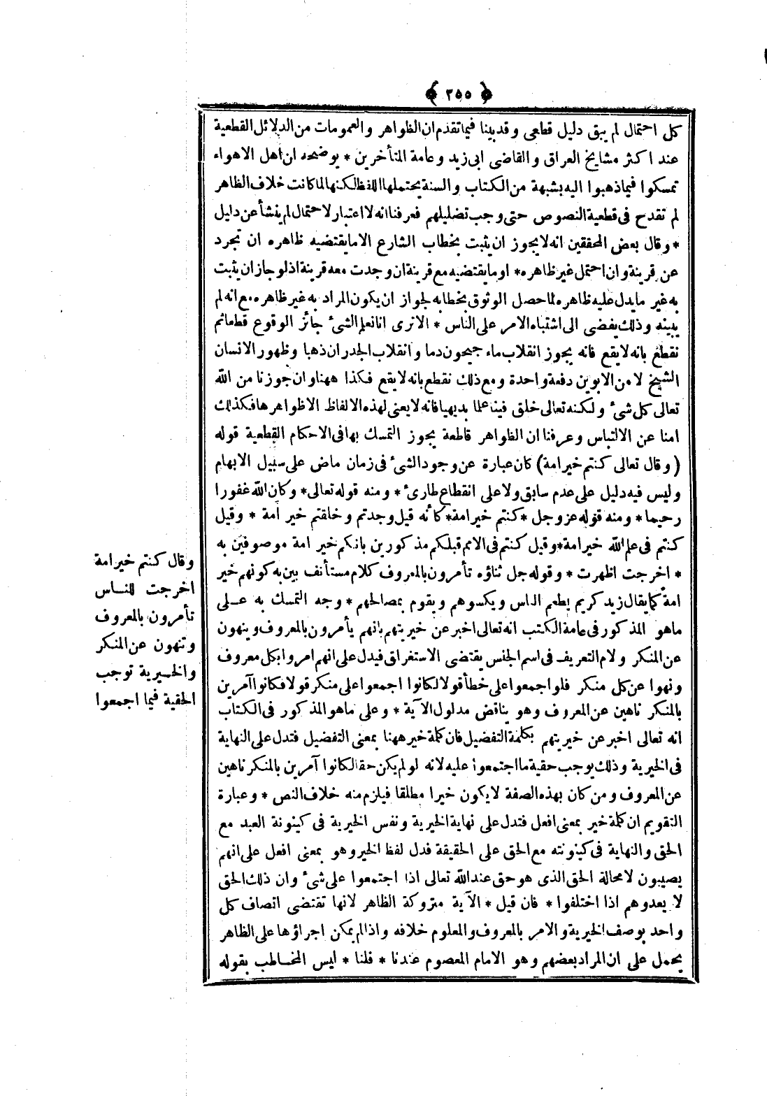فَإِنْ قِيلَ: الْآيَةُ مَتْرُوكَةُ الظَّاهِرِ؛ لِأَنَّهَا تَقْتَضِي اتِّصَافَ كُلِّ وَاحِدٍ بِوَصْفِ الْخَيْرِيَّةِ وَالْأَمْرِ بِالْمَعْرُوفِ وَالْمَعْلُومُ خِلَافُهُ، وَإِذَا لَمْ يُمْكِنْ إجْرَاؤُهَا عَلَى الظَّاهِرِ يُحْمَلُ عَلَى أَنَّ الْمُرَادَ بَعْضُهُمْ، وَهُوَ الْإِمَامُ الْمَعْصُومُ عِنْدَنَا.