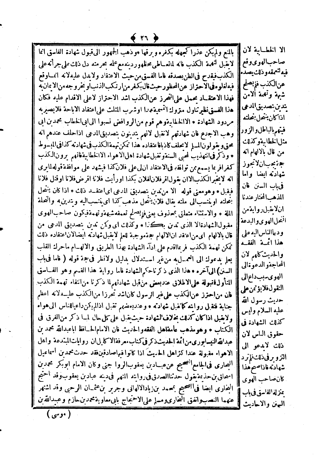إلَّا الْخَطَّابِيَّةَ؛ لِأَنَّ صَاحِبَ الْهَوَى وَقَعَ فِيهِ لِتَعَمُّقِهِ وَذَلِكَ يَصُدُّهُ عَنْ الْكَذِبِ فَلَمْ يَصْلُحْ شُبْهَةً وَتُهْمَةً إلَّا مَنْ يَتَدَيَّنُ بِتَصْدِيقِ الْمُدَّعِي إذَا كَانَ يَنْتَحِلُ بِنِحْلَتِهِ فَيُتَّهَمُ بِالْبَاطِلِ وَالزُّورِ مِثْلُ الْخَطَّابِيَّةِ وَكَذَلِكَ مَنْ قَالَ بِالْإِلْهَامِ: إنَّهُ حُجَّةٌ يَجِبُ أَنْ لَا تَجُوزَ شَهَادَتُهُ أَيْضًا، وَأَمَّا فِي بَابِ السُّنَنِ؛ فَإِنَّ الْمَذْهَبَ الْمُخْتَارَ عِنْدَنَا أَنْ لَا يَقْبَلَ رِوَايَةَ مَنْ انْتَحَلَ الْهَوَى وَالْبِدْعَةَ وَدَعَا النَّاسَ إلَيْهِ عَلَى هَذَا أَئِمَّةُ الْفِقْهِ وَالْحَدِيثِ كُلُّهُمْ؛ لِأَنَّ الْمُحَاجَّةَ وَالدَّعْوَةَ إلَى الْهَوَى سَبَبٌ دَاعٍ إلَى التَّقَوُّلِ فَلَا يُؤْتَمَنُ عَلَى حَدِيثِ رَسُولِ اللَّهِ - صَلَّى اللَّهُ عَلَيْهِ وَسَلَّمَ - وَلَيْسَ كَذَلِكَ الشَّهَادَةُ فِي حُقُوقِ النَّاسِ؛ لِأَنَّ ذَلِكَ لَا يَدْعُو إلَى التَّزْوِيرِ فِي ذَلِكَ فَلَمْ تُرَدَّ شَهَادَتُهُ فَإِذَا صَحَّ هَذَا كَانَ صَاحِبُ الْهَوَى بِمَنْزِلَةِ الْفَاسِقِ فِي بَابِ السُّنَنِ وَالْأَحَادِيثِ.