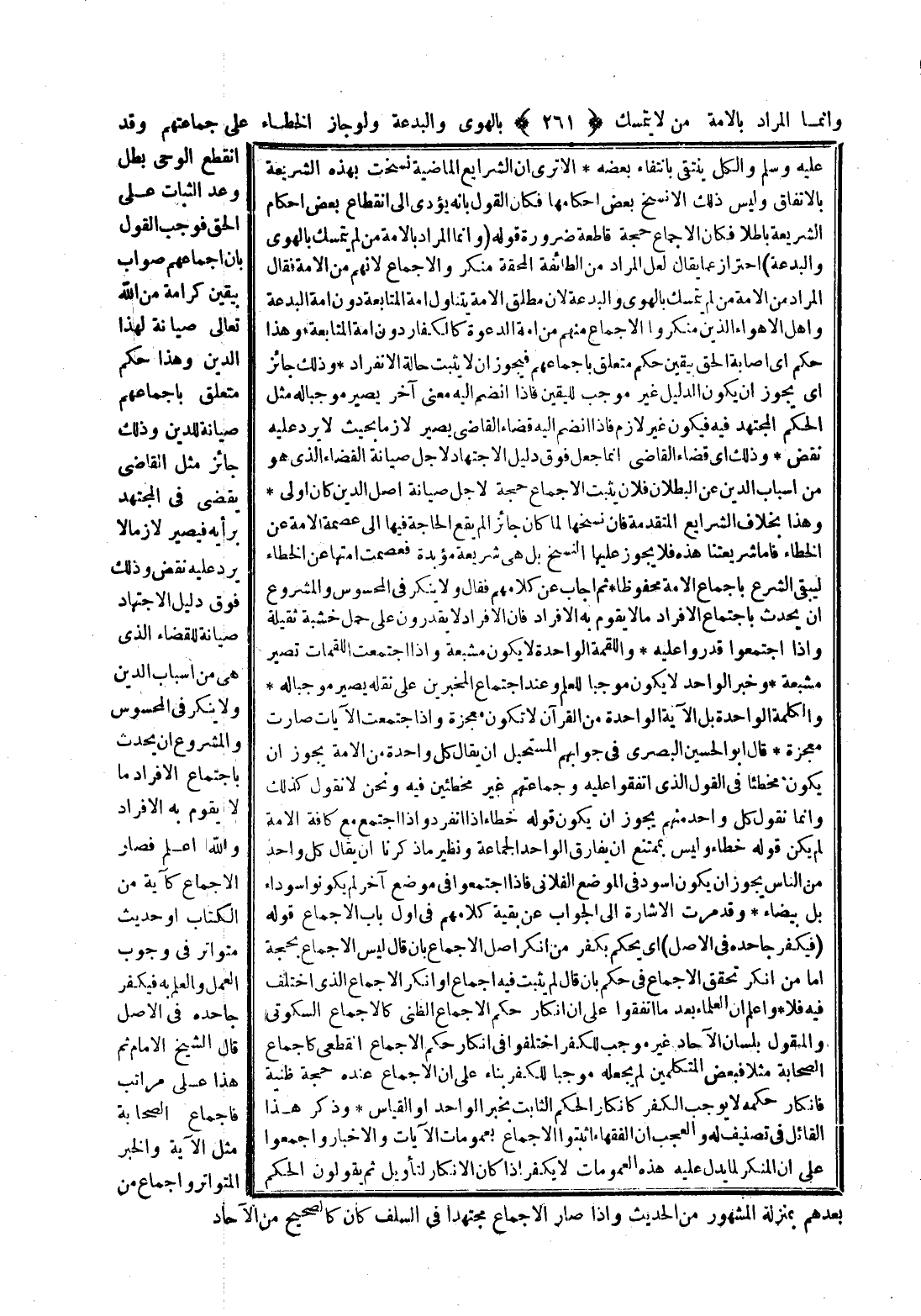 وَإِنَّمَا الْمُرَادُ بِالْأُمَّةِ مَنْ لَا يَتَمَسَّكُ بِالْهَوَى وَالْبِدْعَةِ وَلَوْ جَازَ الْخَطَأُ عَلَى جَمَاعَتِهِمْ، وَقَدْ انْقَطَعَ الْوَحْيُ بَطَلَ وَعْدُ الثَّبَاتِ عَلَى الْحَقِّ فَوَجَبَ الْقَوْلُ بِأَنَّ إجْمَاعَهُمْ صَوَابٌ بِيَقِينٍ كَرَامَةً مِنْ اللَّهِ تَعَالَى صِيَانَةً لِهَذَا الدِّينِ وَهَذَا حُكْمٌ مُتَعَلِّقٌ بِإِجْمَاعِهِمْ صِيَانَةً لِلدِّينِ وَذَلِكَ جَائِزٌ، مِثْلُ الْقَاضِي يَقْضِي فِي الْمُجْتَهَدِ بِرَأْيِهِ فَيَصِيرُ لَازِمًا لَا يَرِدُ عَلَيْهِ نَقْضٌ وَذَلِكَ فَوْقَ دَلِيلِ الِاجْتِهَادِ صِيَانَةً لِلْقَضَاءِ الَّذِي هِيَ مِنْ أَسْبَابِ الدِّينِ وَلَا يُنْكَرُ فِي الْمَحْسُوسِ وَالْمَشْرُوعِ أَنْ يَحْدُثَ بِاجْتِمَاعِ الْأَفْرَادِ مَا لَا يَقُومُ بِهِ الْأَفْرَادُ، وَاَللَّهُ أَعْلَمُ. فَصَارَ الْإِجْمَاعُ كَآيَةٍ مِنْ الْكِتَابِ أَوْ حَدِيثٍ مُتَوَاتِرٍ فِي وُجُوبِ الْعَمَلِ وَالْعِلْمِ بِهِ.