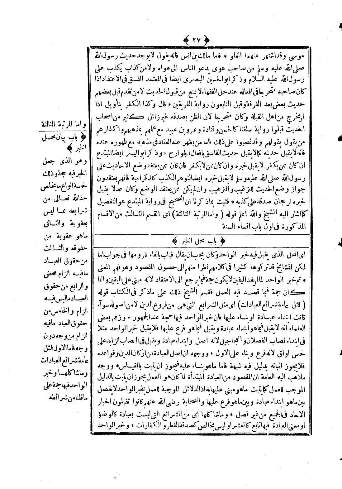 وَأَمَّا الْمَرْتَبَةُ الثَّالِثَةُ (بَابُ بَيَانِ مَحَلِّ الْخَبَرِ) وَهُوَ الَّذِي جُعِلَ الْخَبَرُ فِيهِ حُجَّةً وَذَلِكَ خَمْسَةُ أَنْوَاعٍ مَا يَخْلُصُ حَقًّا لِلَّهِ تَعَالَى مِنْ شَرَائِعِهِ مِمَّا لَيْسَ بِعُقُوبَةٍ وَالثَّانِي مَا هُوَ عُقُوبَةٌ مِنْ حُقُوقِهِ وَالثَّالِثُ مِنْ حُقُوقِ الْعِبَادِ مَا فِيهِ إلْزَامٌ مَحْضٌ، وَالرَّابِعُ مِنْ حُقُوقِ الْعِبَادِ مَا لَيْسَ فِيهِ إلْزَامٌ، وَالْخَامِسُ مِنْ حُقُوقِ الْعِبَادِ مَا فِيهِ إلْزَامٌ مِنْ وَجْهٍ دُونَ وَجْهٍ، فَأَمَّا الْأَوَّلُ فَمِثْلُ عَامَّةِ شَرَائِعِ الْعِبَادَاتِ وَمَا شَاكَلَهَا وَخَبَرُ الْوَاحِدِ فِيهَا حُجَّةٌ عَلَى مَا قُلْنَا مِنْ شَرَائِطِهِ