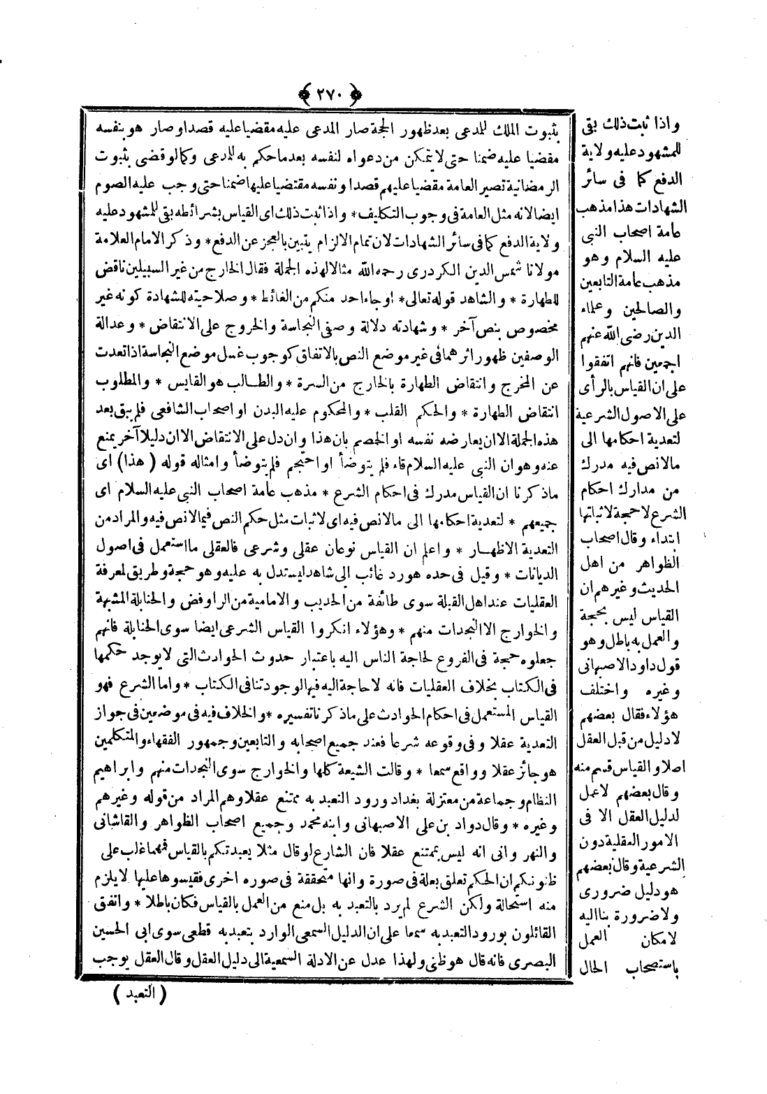 وَإِذَا ثَبَتَ ذَلِكَ بَقِيَ لِلْمَشْهُودِ عَلَيْهِ وِلَايَةُ الدَّفْعِ كَمَا فِي سَائِرِ الشَّهَادَاتِ هَذَا مَذْهَبُ عَامَّةِ أَصْحَابِ النَّبِيِّ - عَلَيْهِ السَّلَامُ -، وَهُوَ مَذْهَبُ عَامَّةِ التَّابِعِينَ وَالصَّالِحِينَ وَعُلَمَاءِ الدِّينِ - رَضِيَ اللَّهُ عَنْهُمْ - أَجْمَعِينَ؛ فَإِنَّهُمْ اتَّفَقُوا عَلَى أَنَّ الْقِيَاسَ بِالرَّأْيِ عَلَى الْأُصُولِ الشَّرْعِيَّةِ لِتَعْدِيَةِ أَحْكَامِهَا إلَى مَا لَا نَصَّ فِيهِ مَدْرَكٌ مِنْ مَدَارِك أَحْكَامِ الشَّرْعِ لَا حُجَّةٌ لِإِثْبَاتِهَا ابْتِدَاءً، وَقَالَ أَصْحَابُ الظَّوَاهِرِ مِنْ أَهْلِ الْحَدِيثِ وَغَيْرِهِمْ: إنَّ الْقِيَاسَ لَيْسَ بِحُجَّةٍ وَالْعَمَلُ بِهِ بَاطِلٌ، وَهُوَ قَوْلُ دَاوُد الْأَصْبَهَانِيُّ وَغَيْرِهِ وَاخْتَلَفَ هَؤُلَاءِ فَقَالَ بَعْضُهُمْ: لَا دَلِيلَ مِنْ قِبَلِ الْعَقْلِ أَصْلًا وَالْقِيَاسُ قِسْمٌ مِنْهُ، وَقَالَ بَعْضُهُمْ لَا عَمَلَ لِدَلِيلِ الْعَقْلِ إلَّا فِي الْأُمُورِ الْعَقْلِيَّةِ دُونَ الشَّرْعِيَّةِ، وَقَالَ بَعْضُهُمْ: هُوَ دَلِيلٌ ضَرُورِيٌّ وَلَا ضَرُورَةَ بِنَا إلَيْهِ لِإِمْكَانِ الْعَمَلِ بِاسْتِصْحَابِ الْحَالِ.