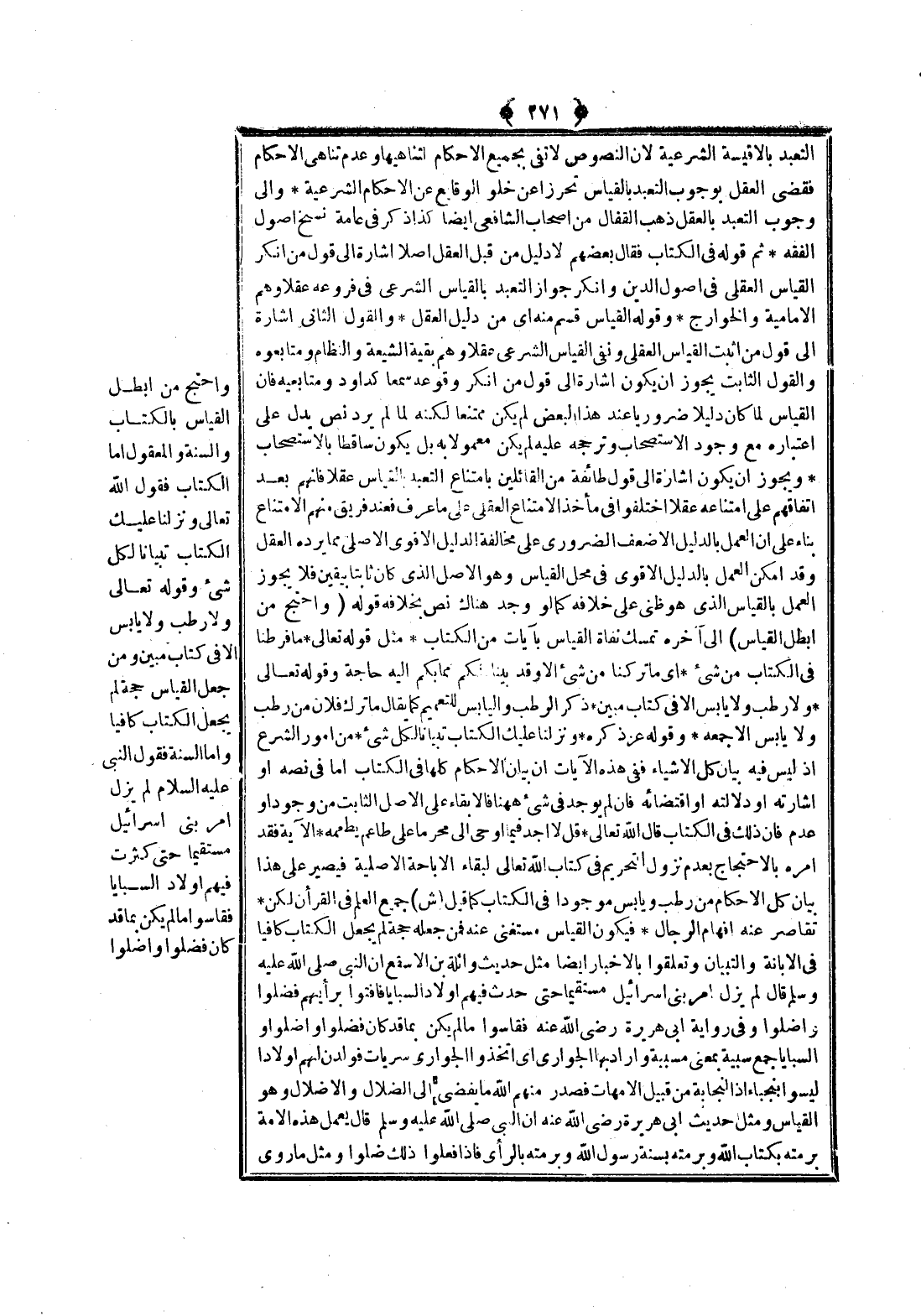 فَيَكُونُ الْقِيَاسُ مُسْتَغْنًى عَنْهُ، فَمَنْ جَعَلَهُ حُجَّةً لَمْ يَجْعَلْ الْكِتَابَ كَافِيًا فِي الْإِبَانَةِ وَالتِّبْيَانِ وَتَعَلَّقُوا بِالْأَخْبَارِ أَيْضًا مِثْلِ حَدِيثِ وَاثِلَةَ بْنِ الْأَسْقَعِ أَنَّ النَّبِيَّ - صَلَّى اللَّهُ عَلَيْهِ وَسَلَّمَ - قَالَ «لَمْ يَزَلْ أَمْرُ بَنِي إسْرَائِيلَ مُسْتَقِيمًا حَتَّى حَدَثَ فِيهِمْ أَوْلَادُ السَّبَايَا فَأَفْتَوْا بِرَأْيِهِمْ فَضَلُّوا وَأَضَلُّوا» وَفِي رِوَايَةِ أَبِي هُرَيْرَةَ - رَضِيَ اللَّهُ عَنْهُ - «فَقَاسُوا مَا لَمْ يَكُنْ بِمَا قَدْ كَانَ فَضَلُّوا وَأَضَلُّوا» السَّبَايَا جَمْعُ سَبِيَّةٍ بِمَعْنَى مَسْبِيَّةٍ وَأَرَادَ بِهَا الْجَوَارِيَ أَيْ اتَّخَذُوا الْجَوَارِيَ سَرِيَّاتٍ فَوَلَدْنَ لَهُمْ أَوْلَادًا لَيْسُوا بِنُجَبَاءَ إذْ النَّجَابَةُ مِنْ قَبِيلِ الْأُمَّهَاتِ فَصَدَرَ مِنْهُمْ مَا يُفْضِي إلَى الضَّلَالِ وَالْإِضْلَالِ، وَهُوَ الْقِيَاسُ وَمِثْلِ حَدِيثِ أَبِي هُرَيْرَةَ - رَضِيَ اللَّهُ عَنْهُ - أَنَّ النَّبِيَّ - صَلَّى اللَّهُ عَلَيْهِ وَسَلَّمَ - قَالَ «تَعْمَلُ هَذِهِ الْأُمَّةُ بُرْهَةً بِكِتَابِ اللَّهِ وَبُرْهَةً بِسُنَّةِ رَسُولِ اللَّهِ وَبُرْهَةً بِالرَّأْيِ فَإِذَا فَعَلُوا ذَلِكَ ضَلُّوا» وَمِثْلِ مَا رَوَى