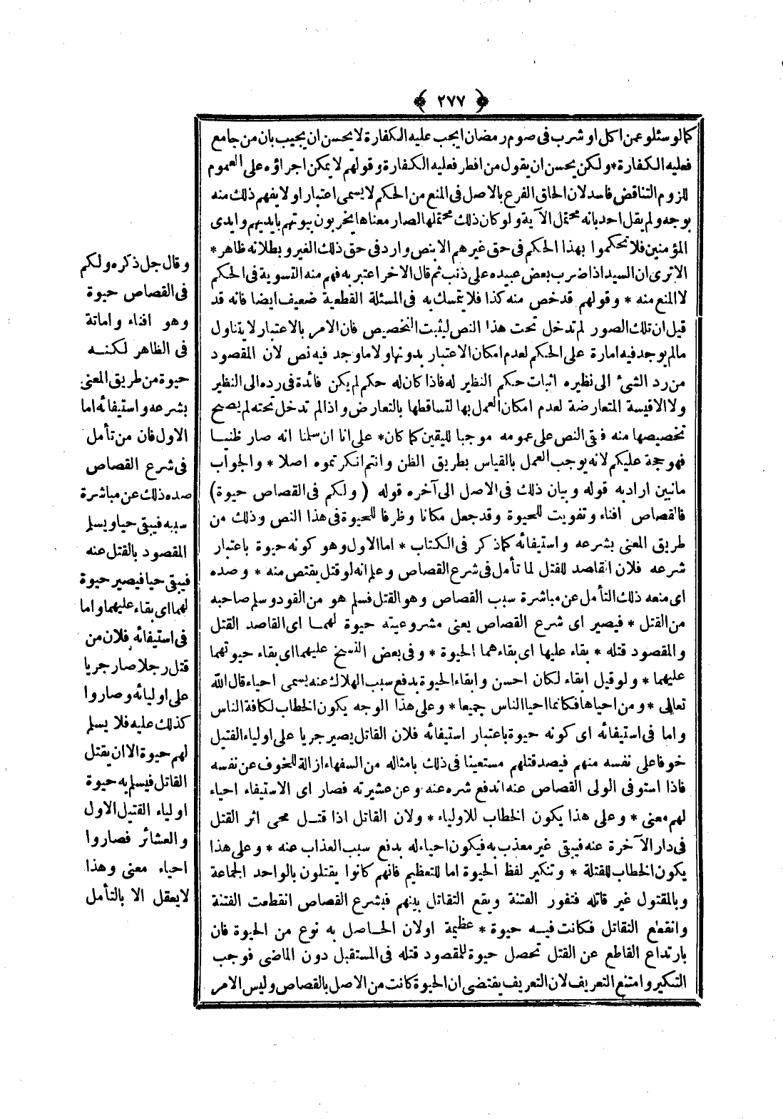 وَقَالَ جَلَّ ذِكْرُهُ {وَلَكُمْ فِي الْقِصَاصِ حَيَاةٌ} [البقرة: 179] وَهُوَ إفْنَاءٌ وَإِمَاتَةٌ فِي الظَّاهِرِ لَكِنَّهُ حَيَاةٌ مِنْ طَرِيقِ الْمَعْنَى بِشَرْعِهِ وَاسْتِيفَائِهِ أَمَّا الْأَوَّلُ؛ فَإِنَّ مَنْ تَأَمَّلَ فِي شَرْعِ الْقِصَاصِ صَدَّهُ ذَلِكَ عَنْ مُبَاشَرَةِ سَبَبِهِ فَيَبْقَى حَيًّا وَيَسْلَمُ الْمَقْصُودُ بِالْقَتْلِ عَنْهُ فَيَبْقَى حَيًّا فَيَصِيرُ حَيَاةً لَهُمَا أَيْ بَقَاءً عَلَيْهِمَا.
